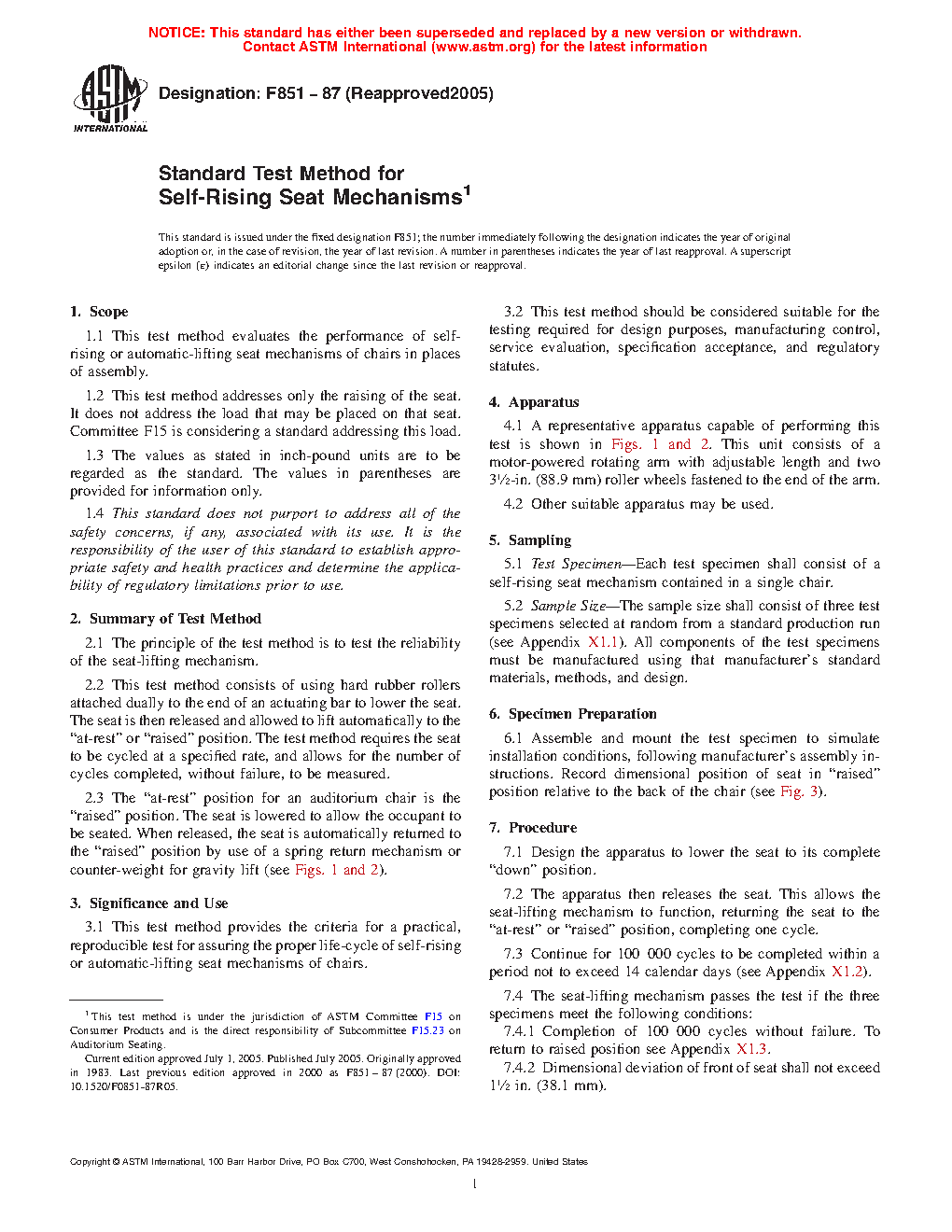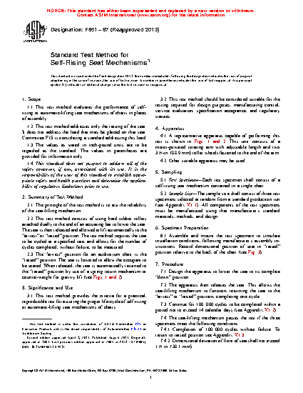1.2 This test method addresses only the raising of the seat. It does not address the load that may be placed on that seat. Committee F15 is considering a standard addressing this load.