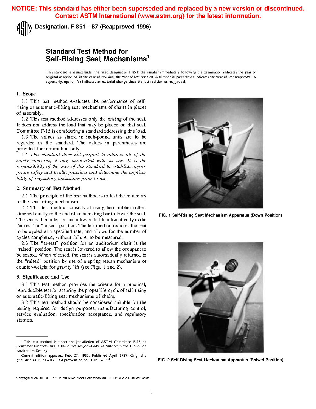 1.2 This test method addresses only the raising of the seat. It does not address the load that may be placed on that seat. Committee F15 is considering a standard addressing this load.