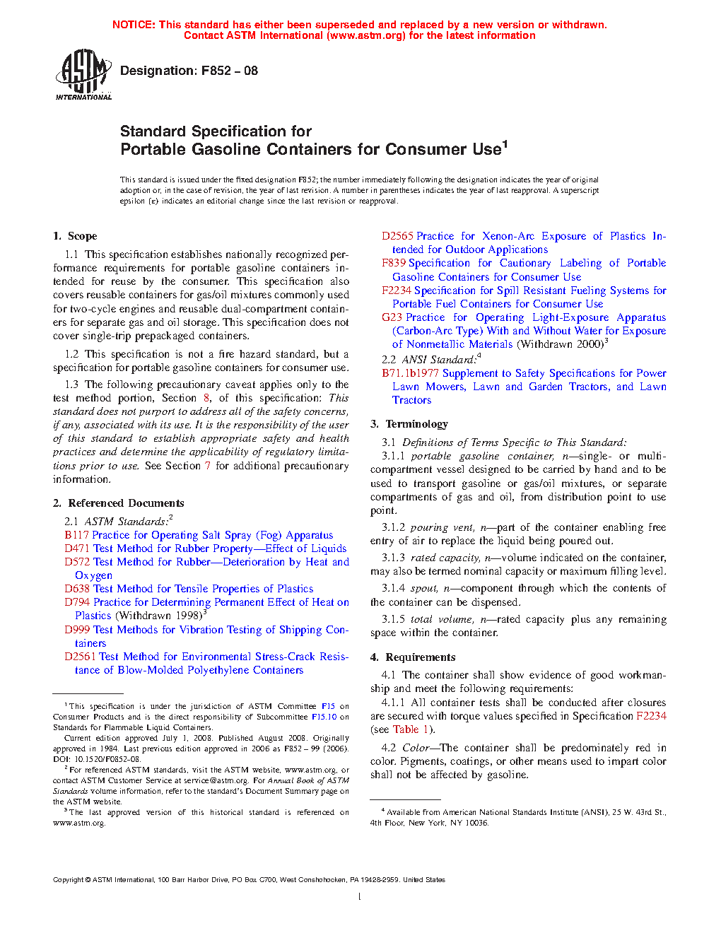 1.1 This specification establishes nationally recognized performance requirements for portable gasoline containers intended for reuse by the consumer. This specification does not cover single-trip prepackaged containers.