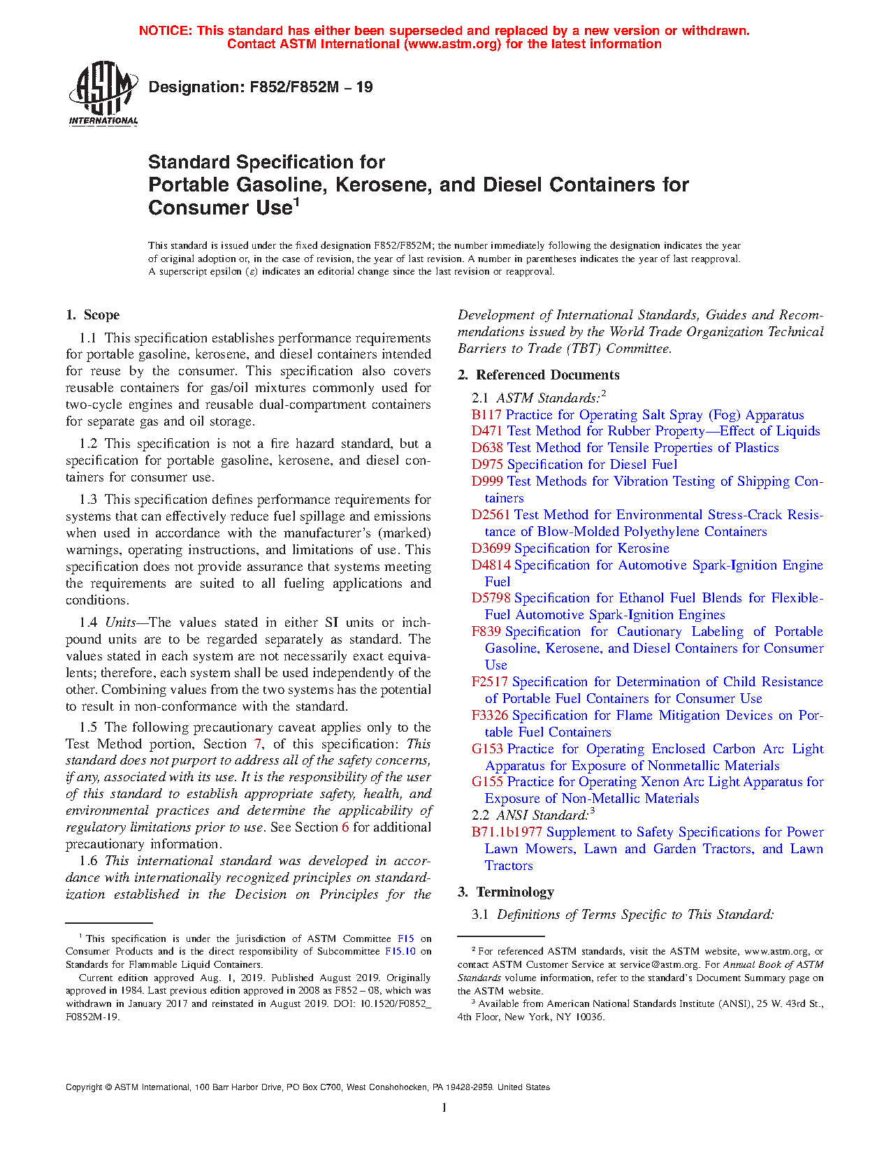 1.2 This specification is not a fire hazard standard, but a specification for portable gasoline, kerosene, and diesel containers for consumer use.