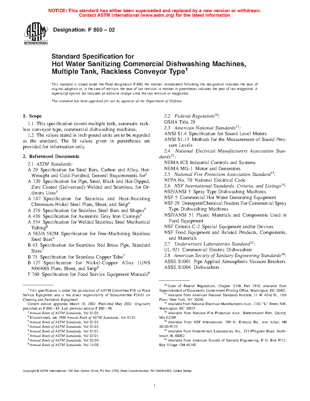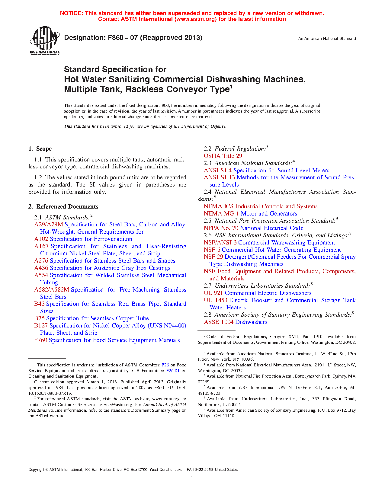 1.1 This specification covers multiple tank, automatic rackless conveyor type, commercial dishwashing machines.