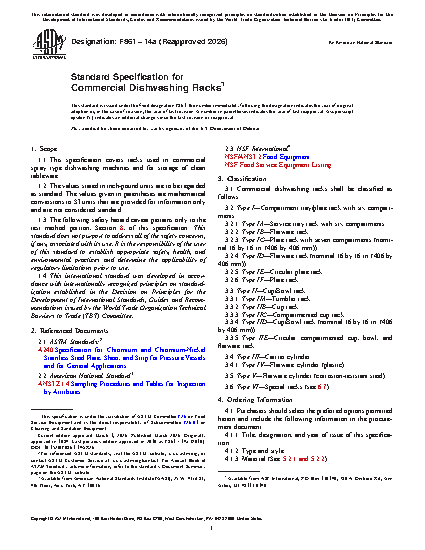 1.1 This specification covers racks used in commercial spray type dishwashing machines and for storage of clean tableware.