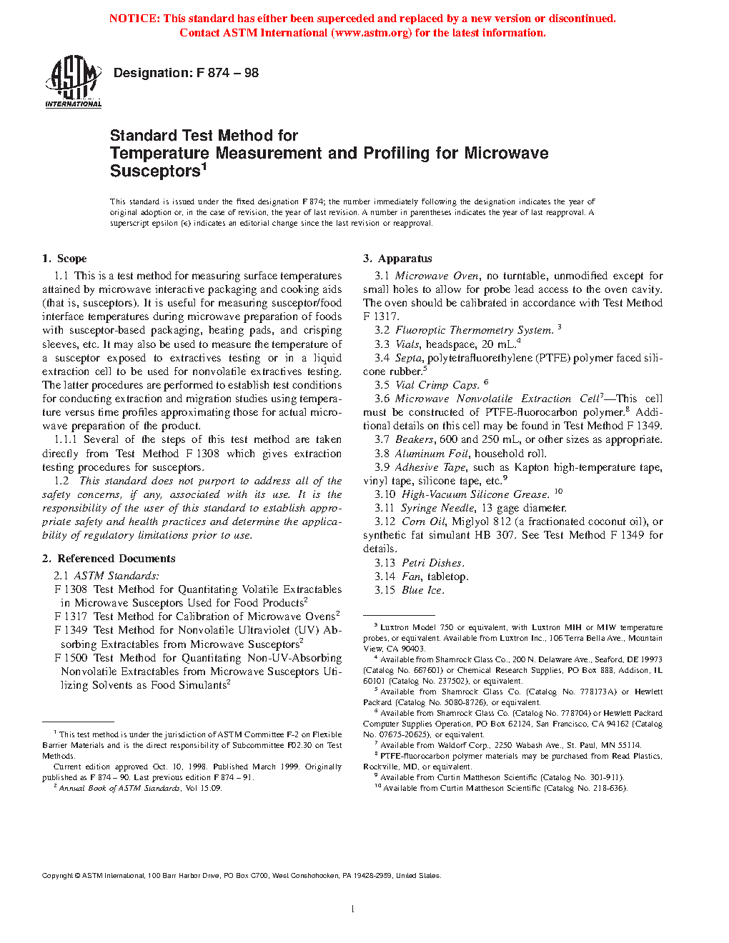 1.1 This is a test method for measuring surface temperatures attained by microwave interactive packaging and cooking aids (that is, susceptors). It is useful for measuring susceptor/food interface temperatures during microwave preparation of foods with susceptor-based packaging, heating pads, and crisping sleeves, etc. It may also be used to measure the temperature of a susceptor exposed to extractives testing or in a liquid extraction cell to be used for nonvolatile extractives testing. The latter procedures are performed to establish test conditions for conducting extraction and migration studies using temperature versus time profiles approximating those for actual microwave preparation of the product.