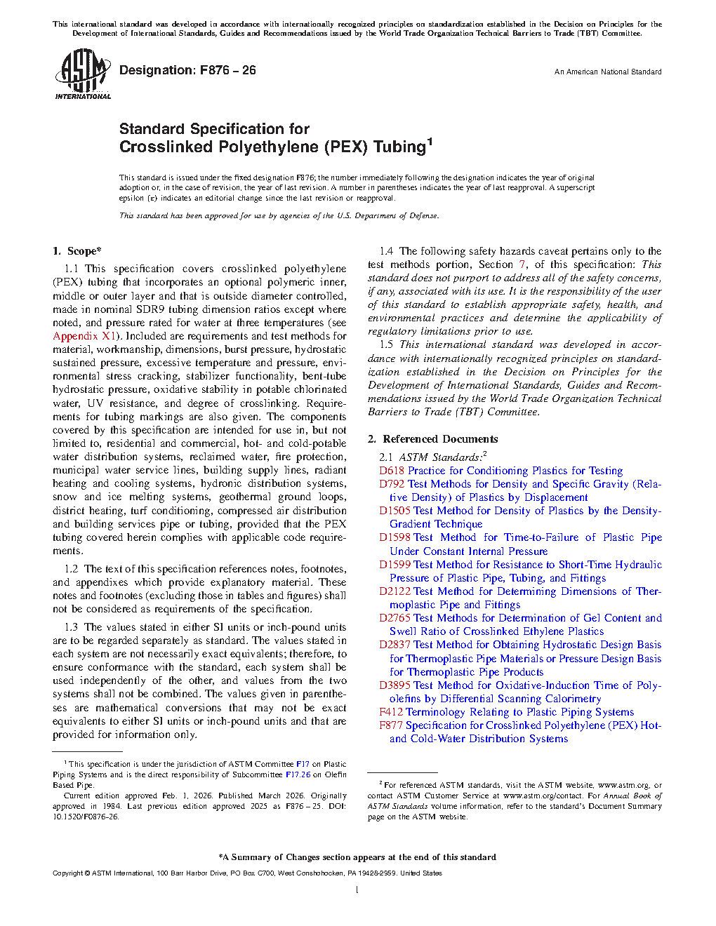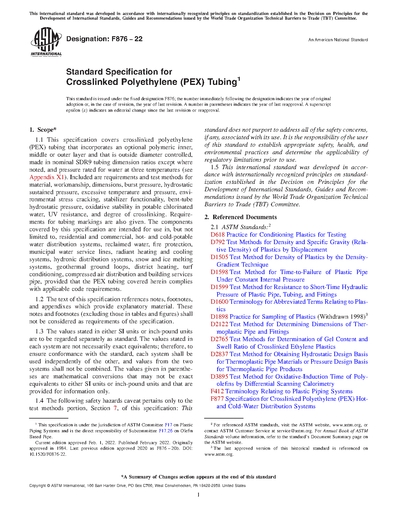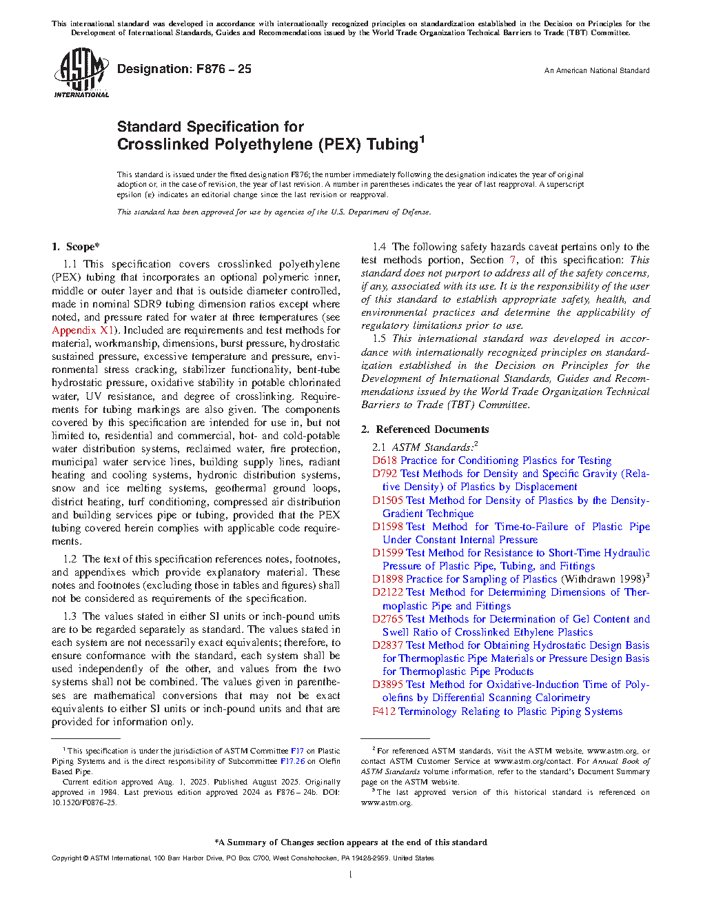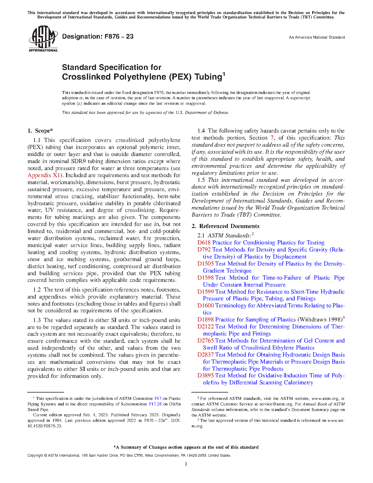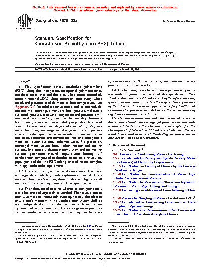1.1 This specification covers crosslinked polyethylene (PEX) tubing that incorporates an optional polymeric inner, middle or outer layer and that is outside diameter controlled, made in nominal SDR9 tubing dimension ratios except where noted, and pressure rated for water at three temperatures (see Appendix X1). Included are requirements and test methods for material, workmanship, dimensions, burst pressure, hydrostatic sustained pressure, excessive temperature and pressure, environmental stress cracking, stabilizer functionality, bent-tube hydrostatic pressure, oxidative stability in potable chlorinated water, UV resistance, and degree of crosslinking. Requirements for tubing markings are also given. The components covered by this specification are intended for use in, but not limited to, residential and commercial, hot- and cold-potable water distribution systems, reclaimed water, fire protection, municipal water service lines, building supply lines, radiant heating and cooling systems, hydronic distribution systems, snow and ice melting systems, geothermal ground loops, district heating, turf conditioning, compressed air distribution and building services pipe, provided that the PEX tubing covered herein complies with applicable code requirements.