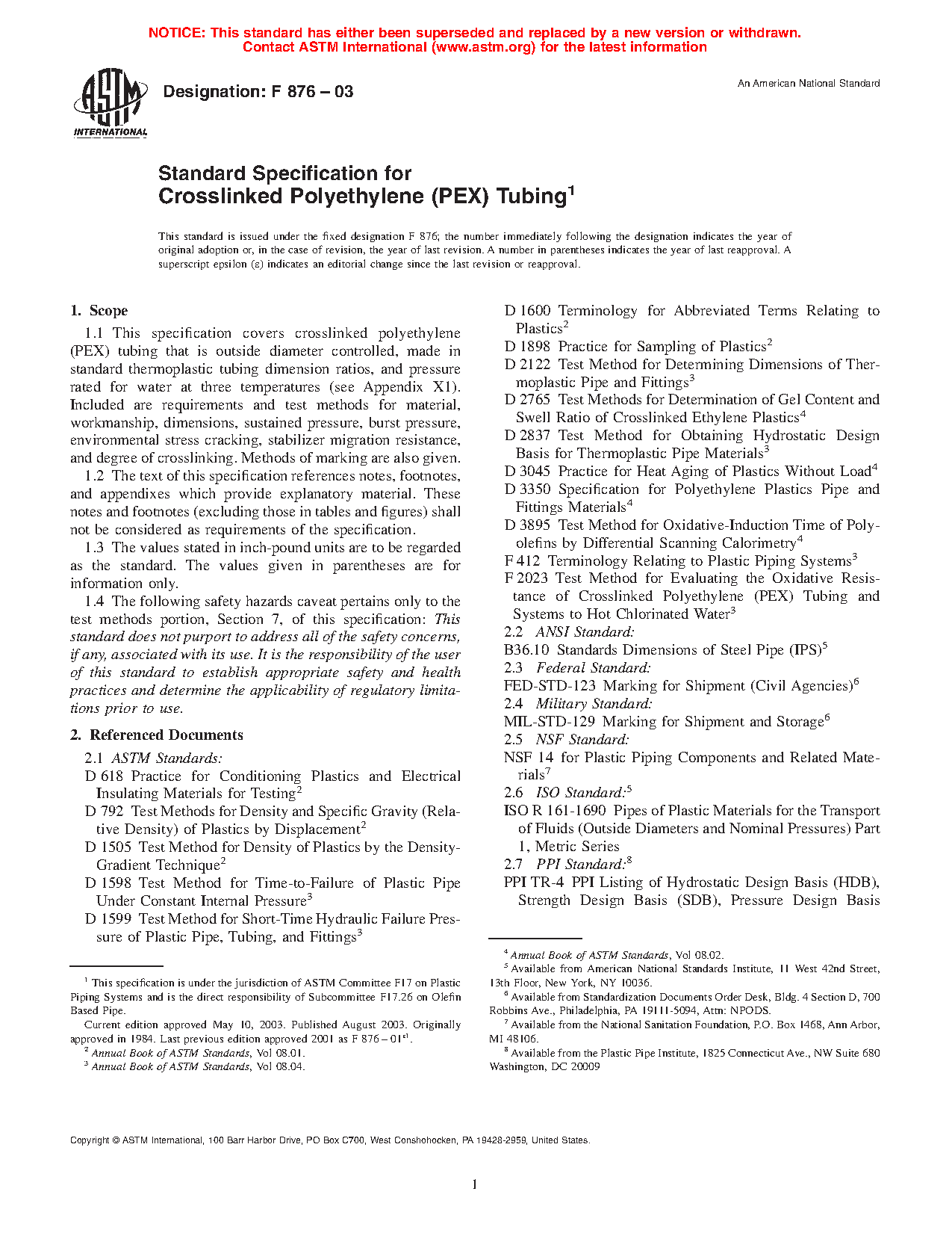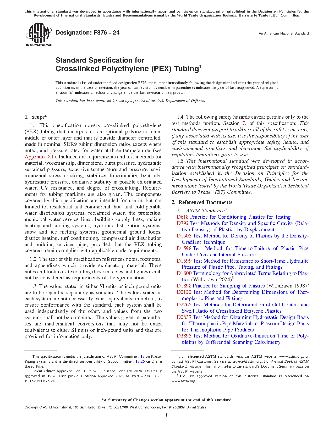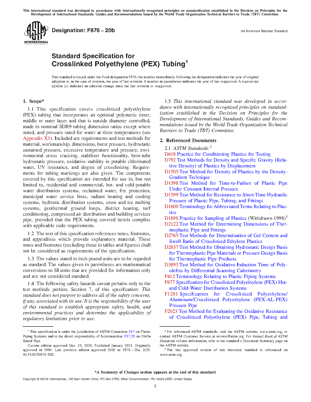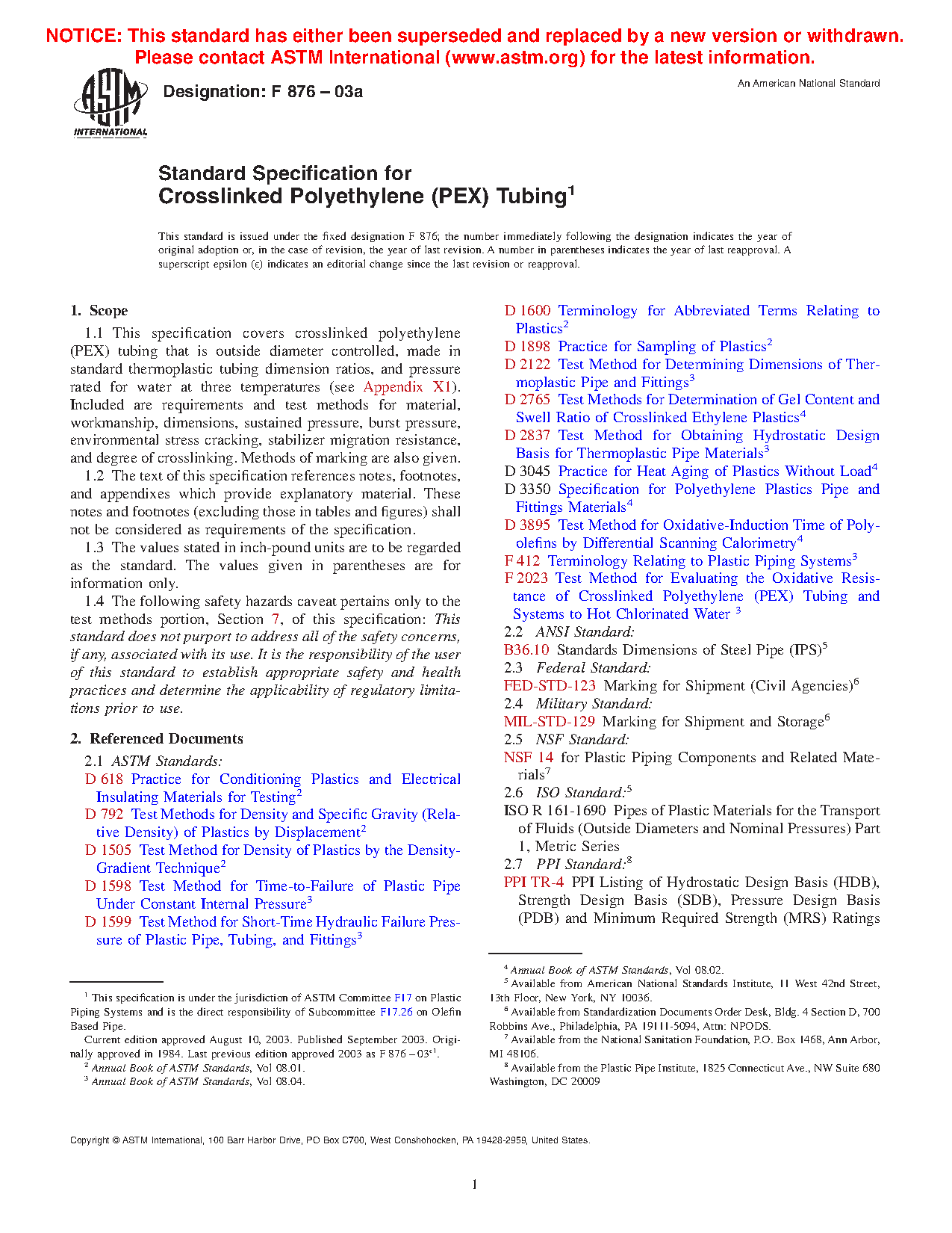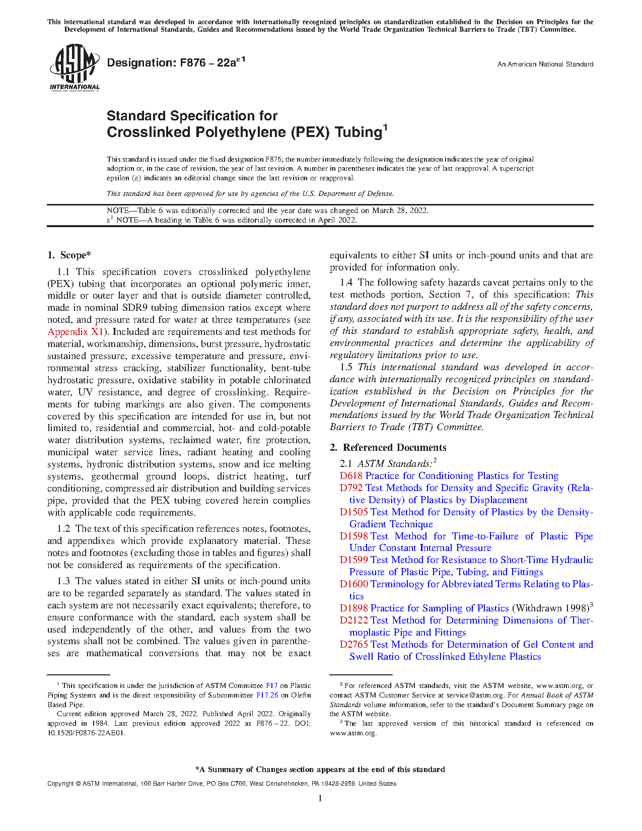 1.1 This specification covers crosslinked polyethylene (PEX) tubing that incorporates an optional polymeric inner, middle or outer layer and that is outside diameter controlled, made in nominal SDR9 tubing dimension ratios except where noted, and pressure rated for water at three temperatures (see Appendix X1). Included are requirements and test methods for material, workmanship, dimensions, burst pressure, hydrostatic sustained pressure, excessive temperature and pressure, environmental stress cracking, stabilizer functionality, bent-tube hydrostatic pressure, oxidative stability in potable chlorinated water, UV resistance, and degree of crosslinking. Requirements for tubing markings are also given. The components covered by this specification are intended for use in, but not limited to, residential and commercial, hot- and cold-potable water distribution systems, reclaimed water, fire protection, municipal water service lines, building supply lines, radiant heating and cooling systems, hydronic distribution systems, snow and ice melting systems, geothermal ground loops, district heating, turf conditioning, compressed air distribution and building services pipe, provided that the PEX tubing covered herein complies with applicable code requirements.