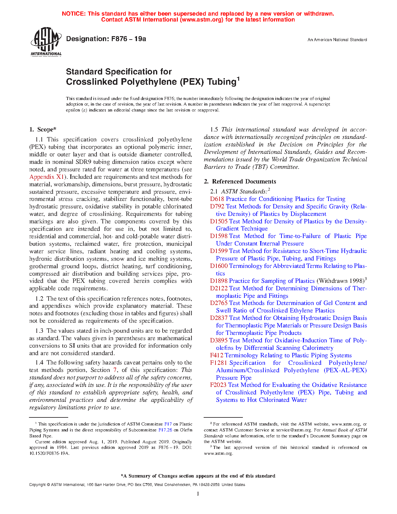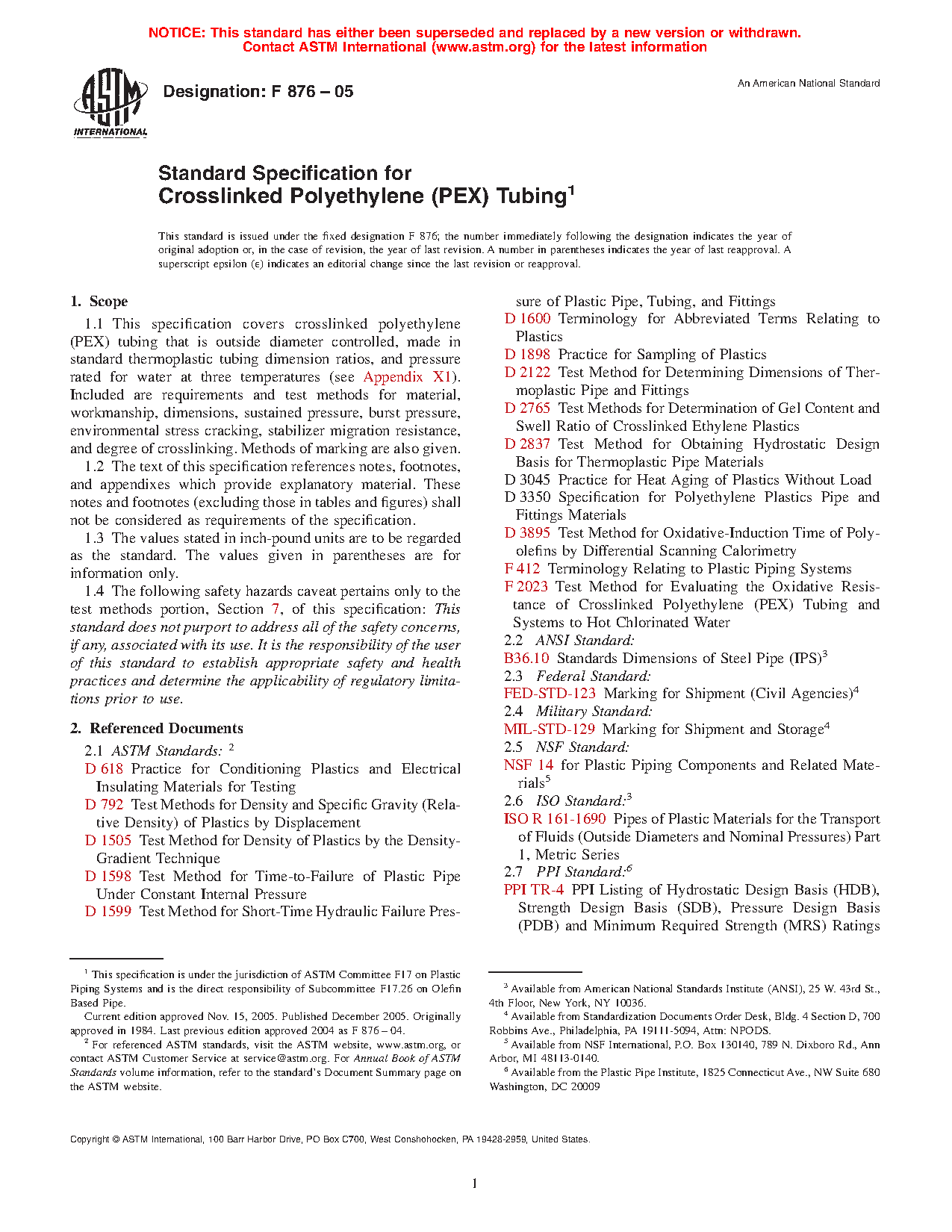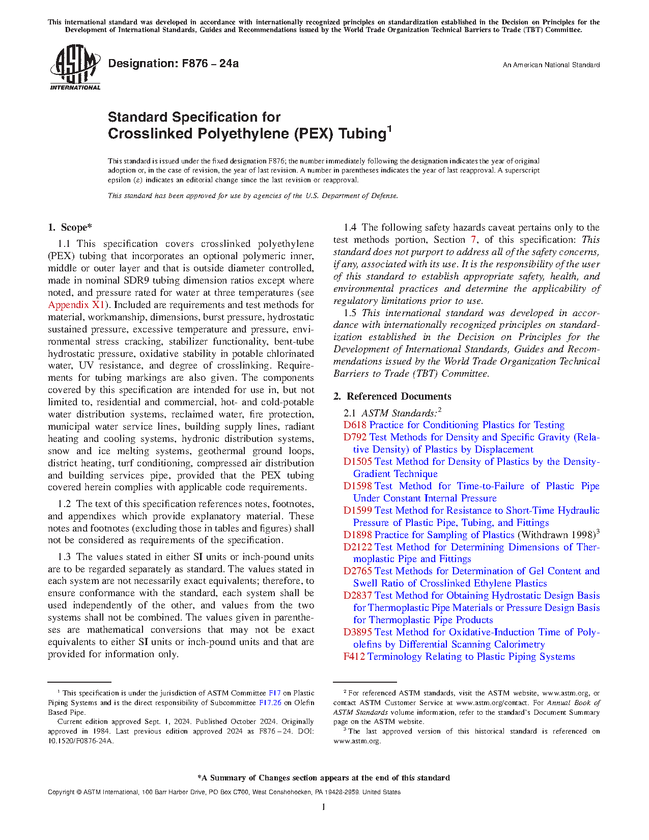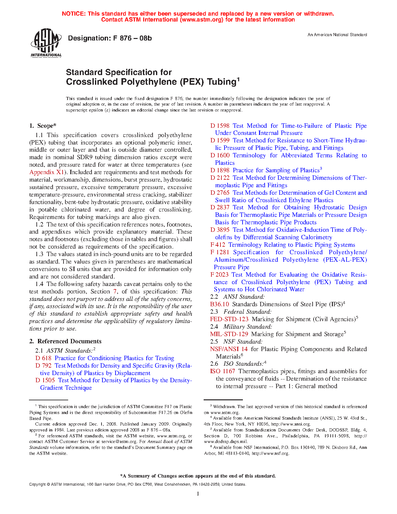 1.1 This specification covers crosslinked polyethylene (PEX) tubing that incorporates an optional polymeric inner, middle or outer layer and that is outside diameter controlled, made in nominal SDR9 tubing dimension ratios except where noted, and pressure rated for water at three temperatures (see Appendix X1). Included are requirements and test methods for material, workmanship, dimensions, burst pressure, hydrostatic sustained pressure, excessive temperature and pressure, environmental stress cracking, stabilizer functionality, bent-tube hydrostatic pressure, oxidative stability in potable chlorinated water, UV resistance, and degree of crosslinking. Requirements for tubing markings are also given. The components covered by this specification are intended for use in, but not limited to, residential and commercial, hot- and cold-potable water distribution systems, reclaimed water, fire protection, municipal water service lines, building supply lines, radiant heating and cooling systems, hydronic distribution systems, snow and ice melting systems, geothermal ground loops, district heating, turf conditioning, compressed air distribution and building services pipe, provided that the PEX tubing covered herein complies with applicable code requirements.