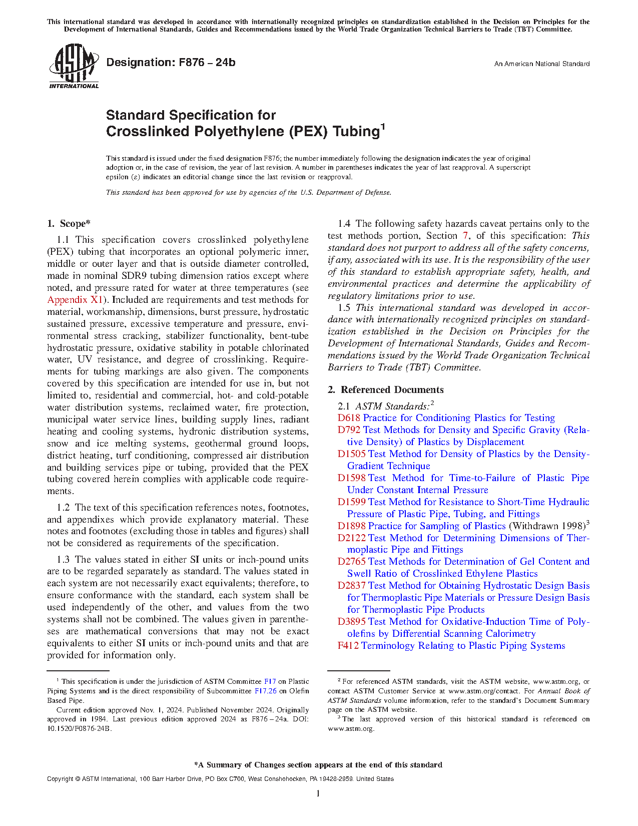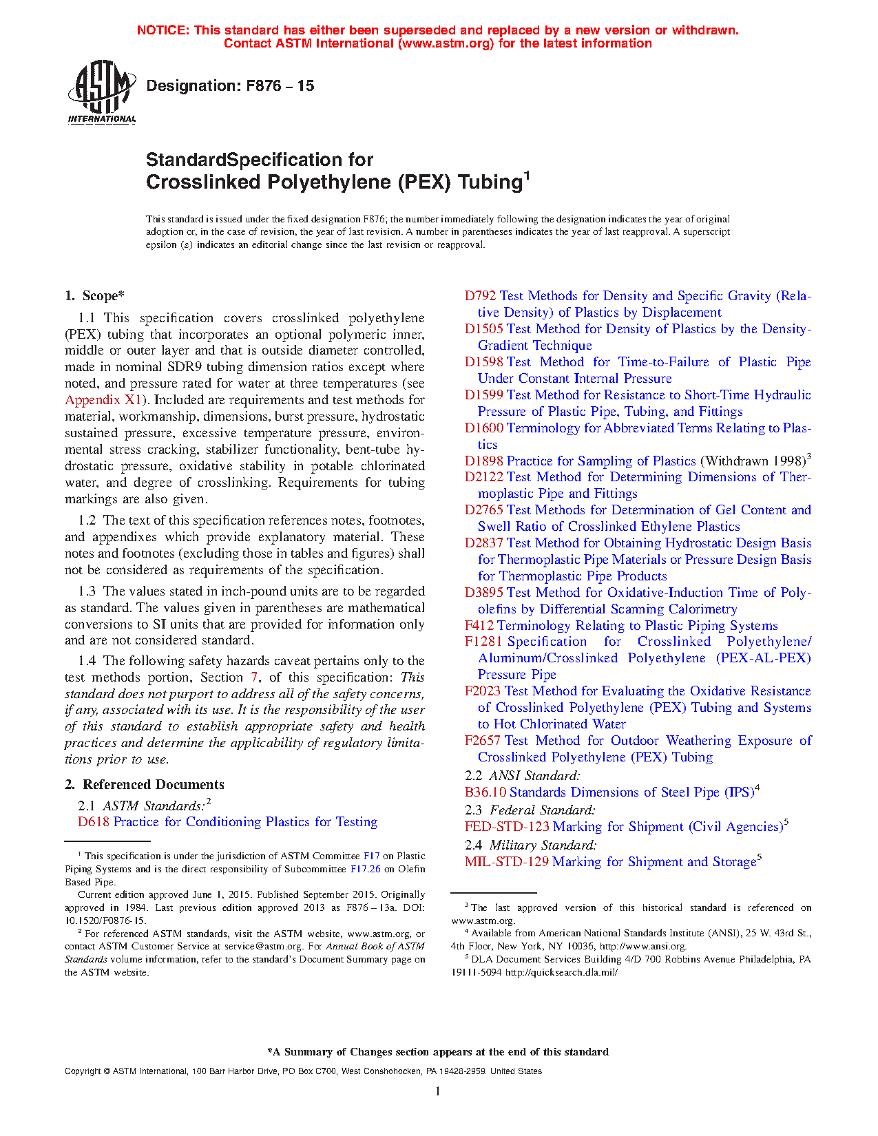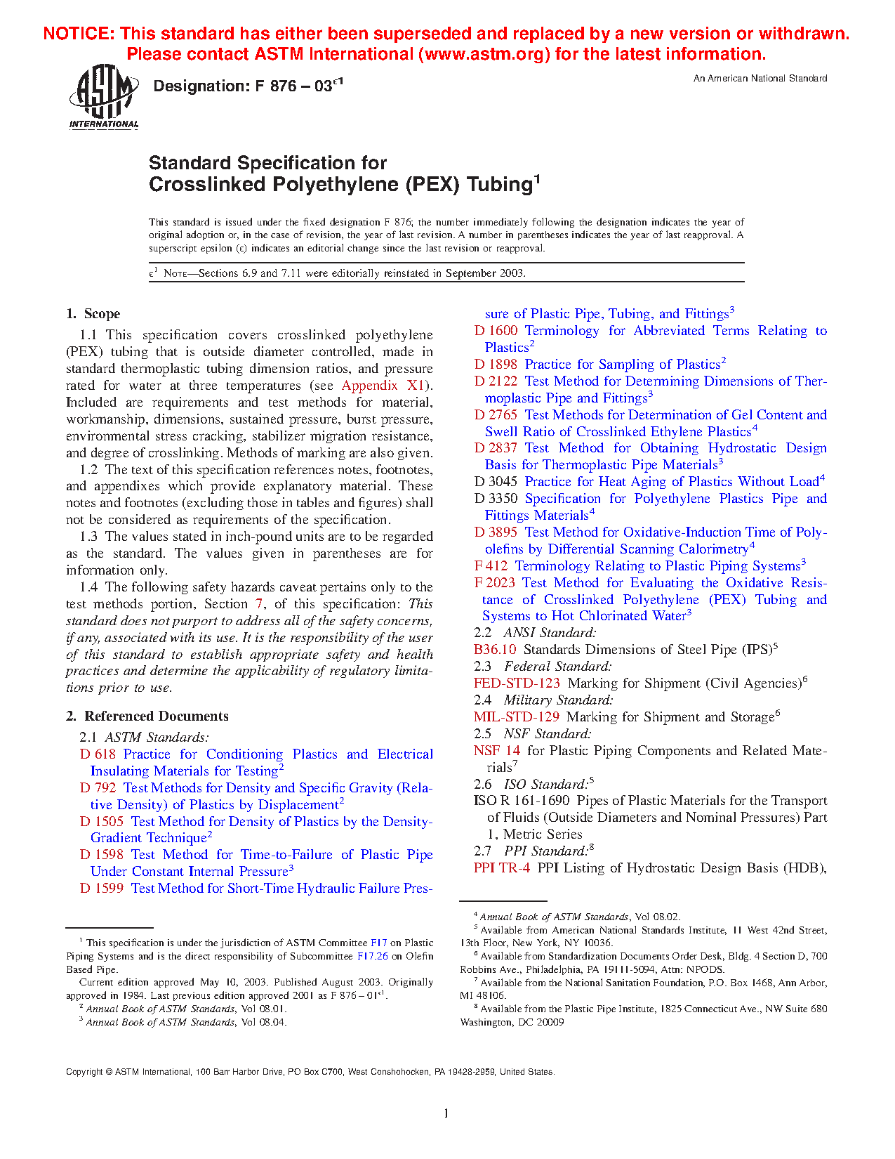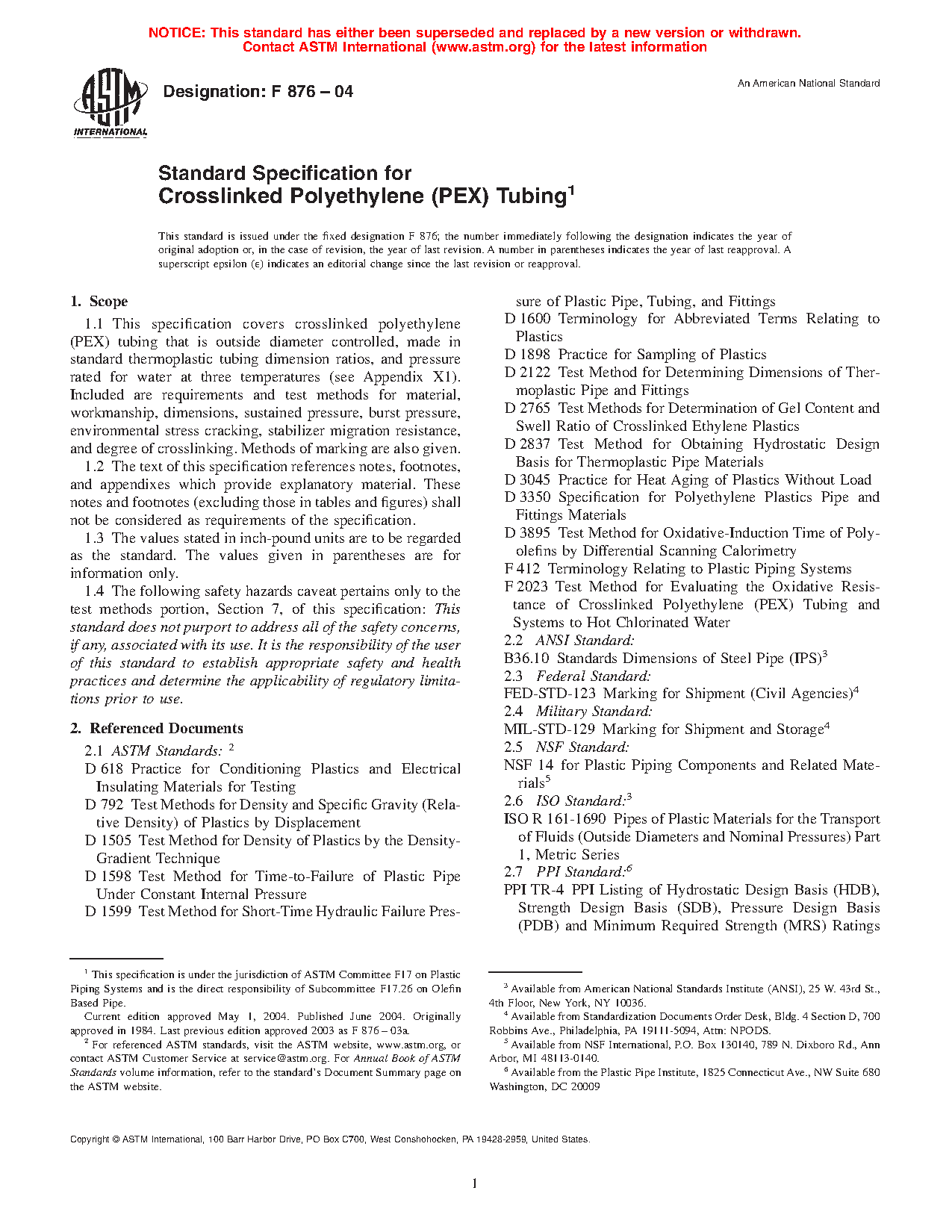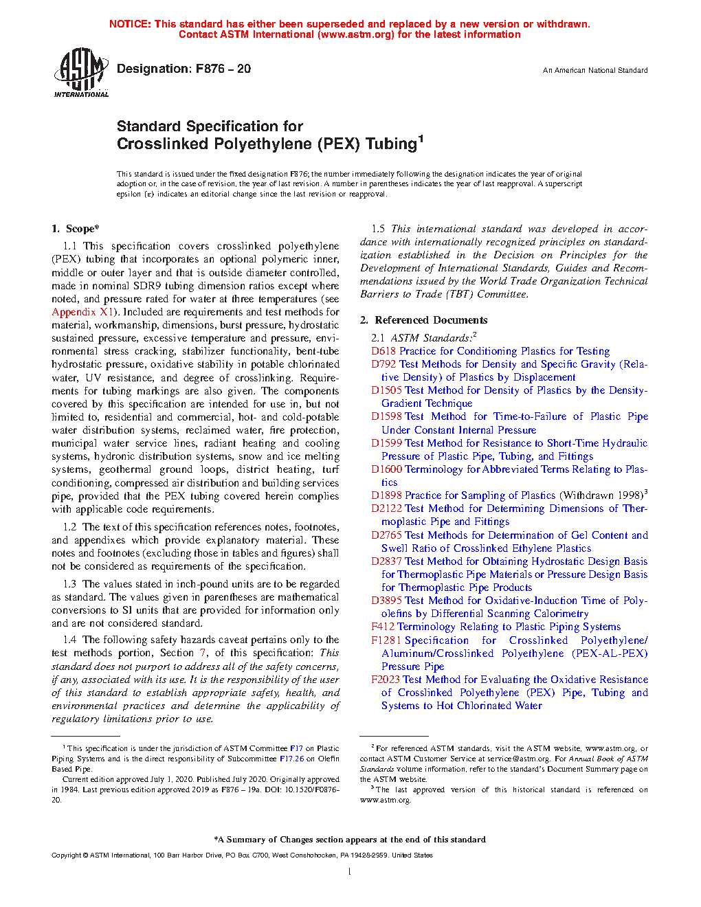 1.1 This specification covers crosslinked polyethylene (PEX) tubing that incorporates an optional polymeric inner, middle or outer layer and that is outside diameter controlled, made in nominal SDR9 tubing dimension ratios except where noted, and pressure rated for water at three temperatures (see Appendix X1). Included are requirements and test methods for material, workmanship, dimensions, burst pressure, hydrostatic sustained pressure, excessive temperature and pressure, environmental stress cracking, stabilizer functionality, bent-tube hydrostatic pressure, oxidative stability in potable chlorinated water, UV resistance, and degree of crosslinking. Requirements for tubing markings are also given. The components covered by this specification are intended for use in, but not limited to, residential and commercial, hot- and cold-potable water distribution systems, reclaimed water, fire protection, municipal water service lines, building supply lines, radiant heating and cooling systems, hydronic distribution systems, snow and ice melting systems, geothermal ground loops, district heating, turf conditioning, compressed air distribution and building services pipe, provided that the PEX tubing covered herein complies with applicable code requirements.