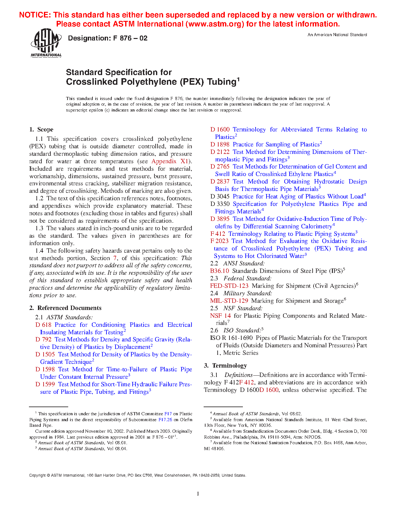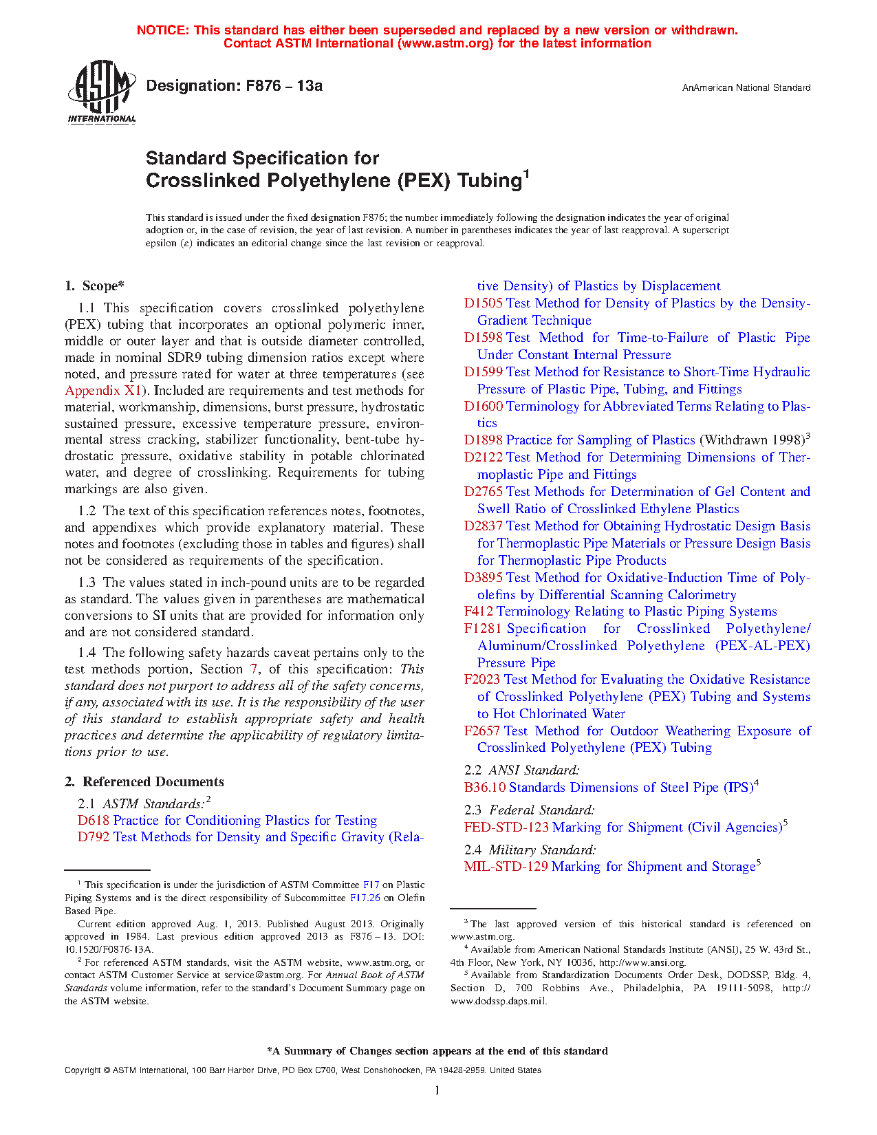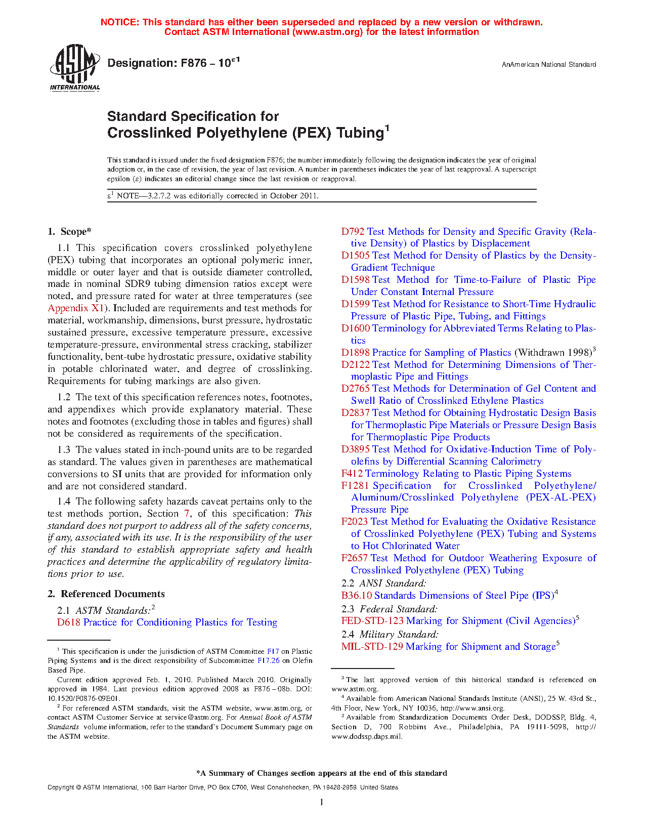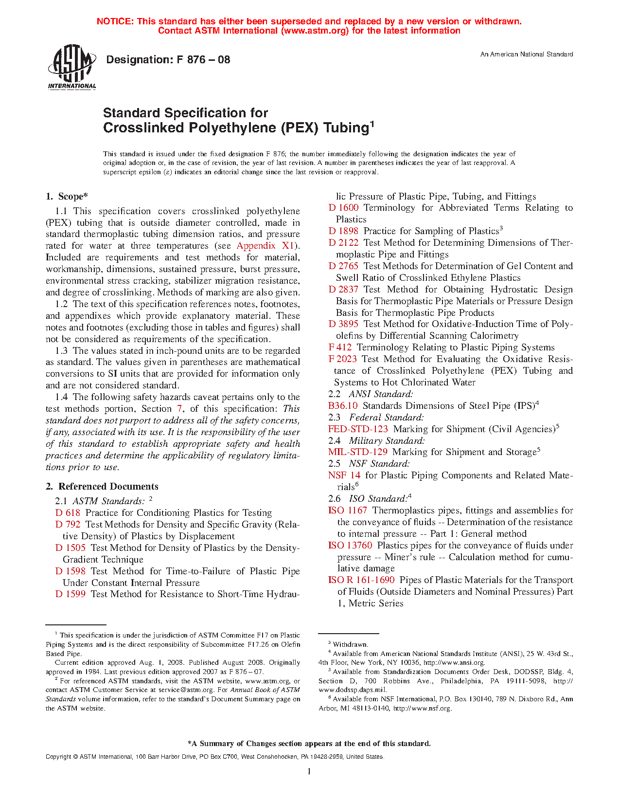 1.1 This specification covers crosslinked polyethylene (PEX) tubing that incorporates an optional polymeric inner, middle or outer layer and that is outside diameter controlled, made in nominal SDR9 tubing dimension ratios except where noted, and pressure rated for water at three temperatures (see Appendix X1). Included are requirements and test methods for material, workmanship, dimensions, burst pressure, hydrostatic sustained pressure, excessive temperature and pressure, environmental stress cracking, stabilizer functionality, bent-tube hydrostatic pressure, oxidative stability in potable chlorinated water, UV resistance, and degree of crosslinking. Requirements for tubing markings are also given. The components covered by this specification are intended for use in, but not limited to, residential and commercial, hot- and cold-potable water distribution systems, reclaimed water, fire protection, municipal water service lines, building supply lines, radiant heating and cooling systems, hydronic distribution systems, snow and ice melting systems, geothermal ground loops, district heating, turf conditioning, compressed air distribution and building services pipe, provided that the PEX tubing covered herein complies with applicable code requirements.
