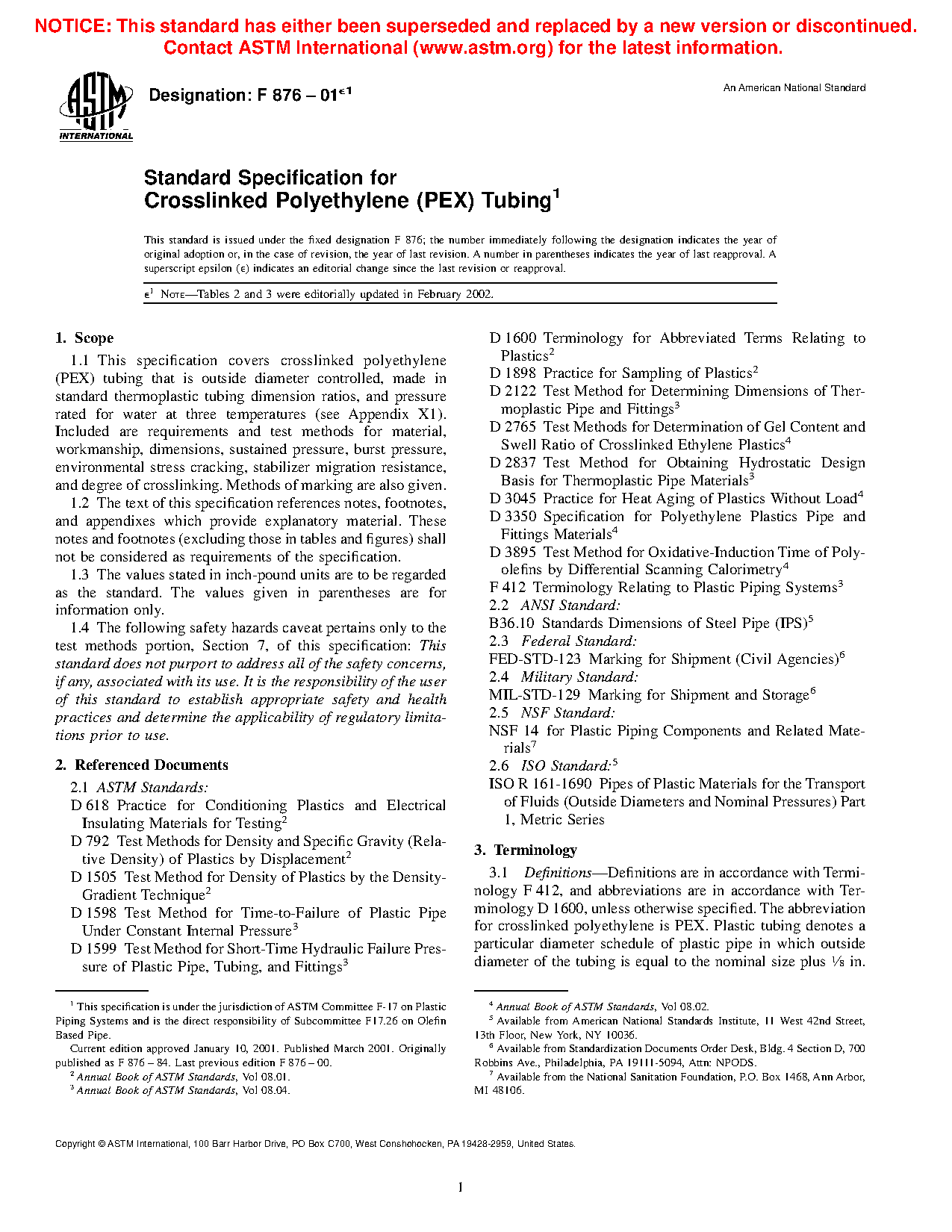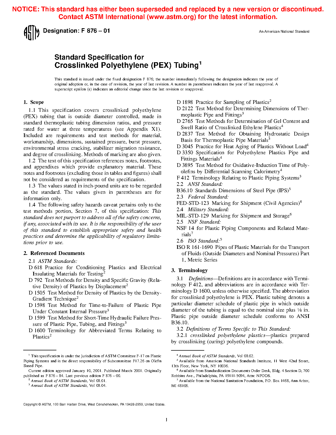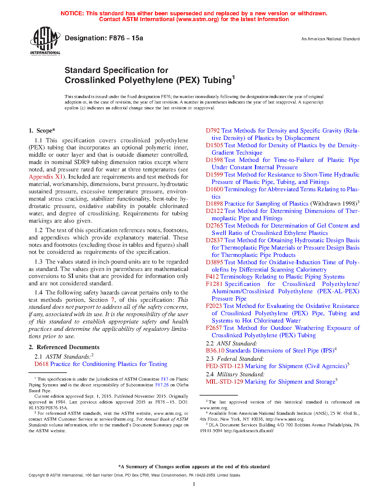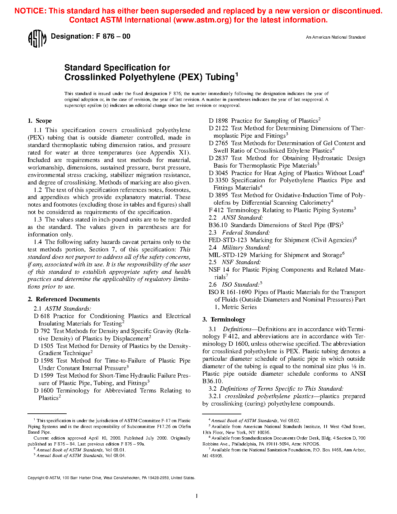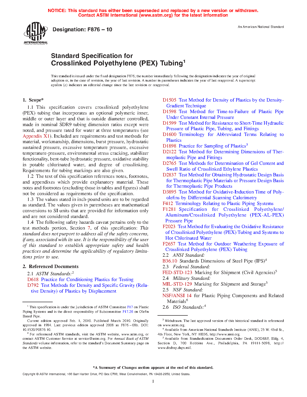 1.1 This specification covers crosslinked polyethylene (PEX) tubing that incorporates an optional polymeric inner, middle or outer layer and that is outside diameter controlled, made in nominal SDR9 tubing dimension ratios except where noted, and pressure rated for water at three temperatures (see Appendix X1). Included are requirements and test methods for material, workmanship, dimensions, burst pressure, hydrostatic sustained pressure, excessive temperature and pressure, environmental stress cracking, stabilizer functionality, bent-tube hydrostatic pressure, oxidative stability in potable chlorinated water, UV resistance, and degree of crosslinking. Requirements for tubing markings are also given. The components covered by this specification are intended for use in, but not limited to, residential and commercial, hot- and cold-potable water distribution systems, reclaimed water, fire protection, municipal water service lines, building supply lines, radiant heating and cooling systems, hydronic distribution systems, snow and ice melting systems, geothermal ground loops, district heating, turf conditioning, compressed air distribution and building services pipe, provided that the PEX tubing covered herein complies with applicable code requirements.