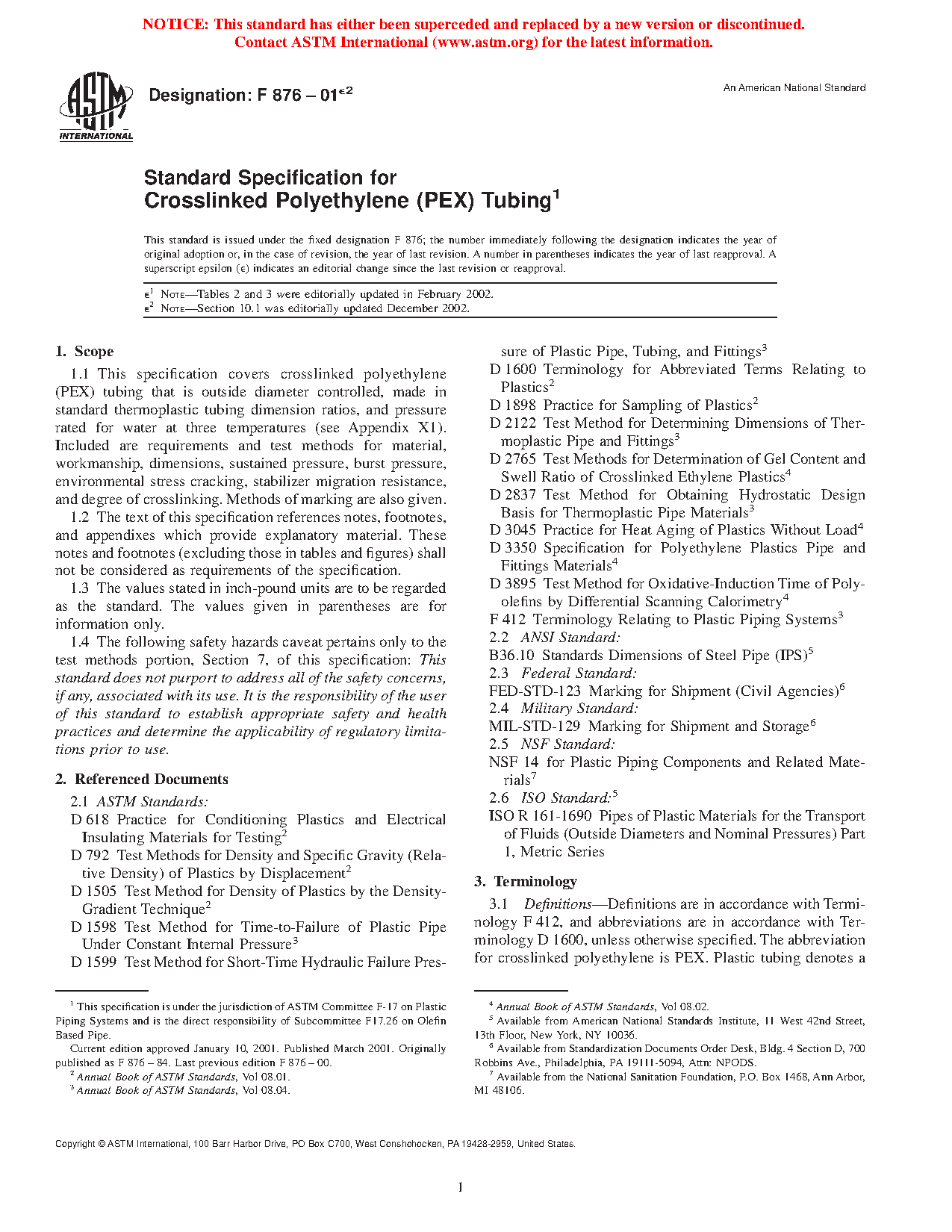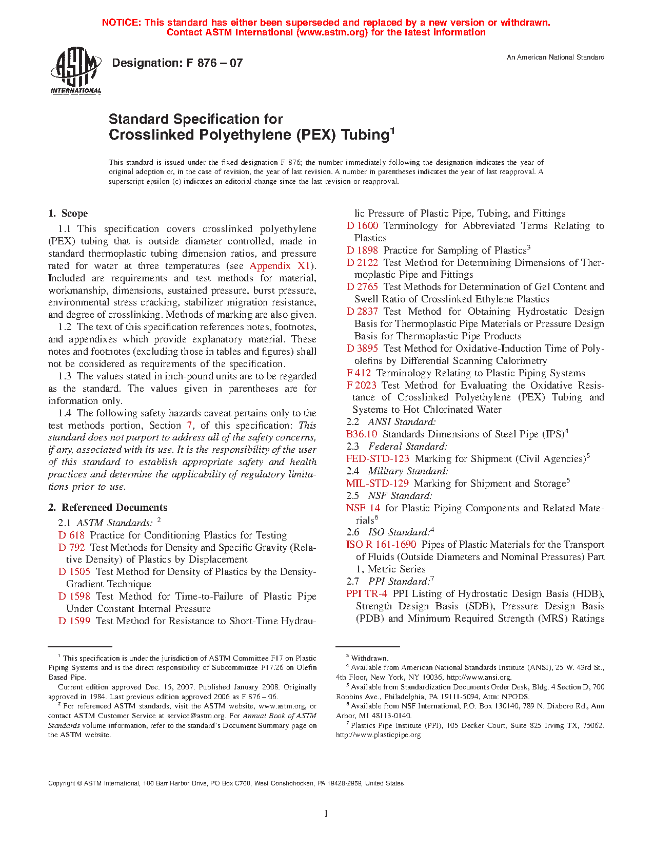 This specification covers crosslinked polyethylene (PEX) tubing that is outside diameter controlled, made in standard thermoplastic tubing dimension ratios, and pressure rated for water at three temperatures. This specification covers one PEX tubing material in one standard dimension ratio and having pressure ratings for water of three temperatures. The pressure ratings decrease as the temperature is increased. PEX tubing shall be made from polyethylene compounds which have been crosslinked by peroxides, Azo compounds, or silane compounds in extrusion, or by electron beam after extrusion, or by other means such that the tubing meets the performance requirements. The following tests shall be performed: dimensions and tolerances; density; sustained pressure test; burst pressure; environmental stress cracking test; degree of crosslinking; stabilizer functionality; and oxidative stability in potable chlorinated water applications.