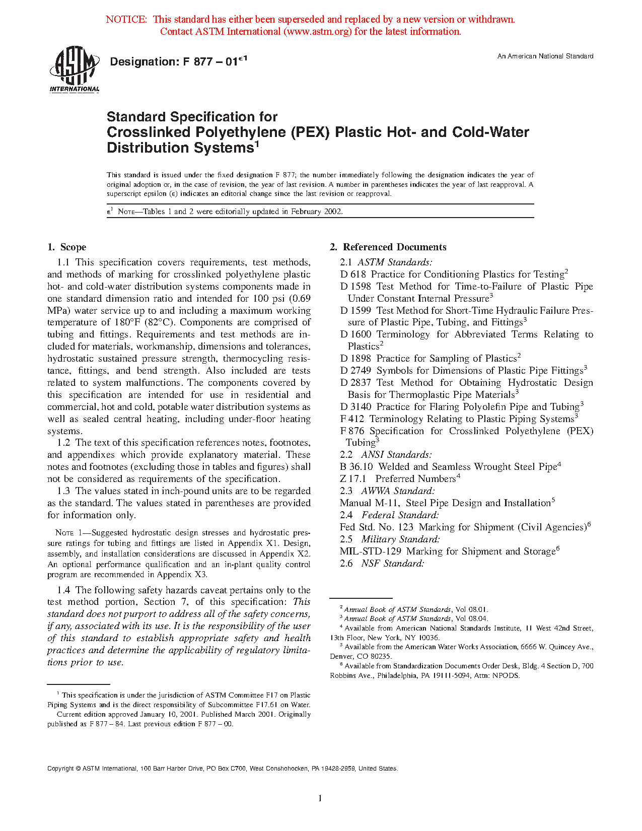 Note 1: Suggested hydrostatic design stresses and hydrostatic pressure ratings for tubing and fittings are listed in Appendix X1. Design, assembly, and installation considerations are discussed in Appendix X2. An optional performance qualification and an in-plant quality control program are recommended in Appendix X3. For additional information on the use of PEX tubing for high-temperature non-potable applications and for chlorinated potable water, see PPI Technical Notes 52 and 53, respectively.