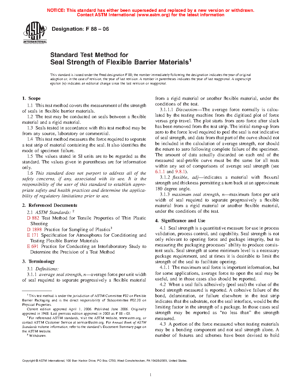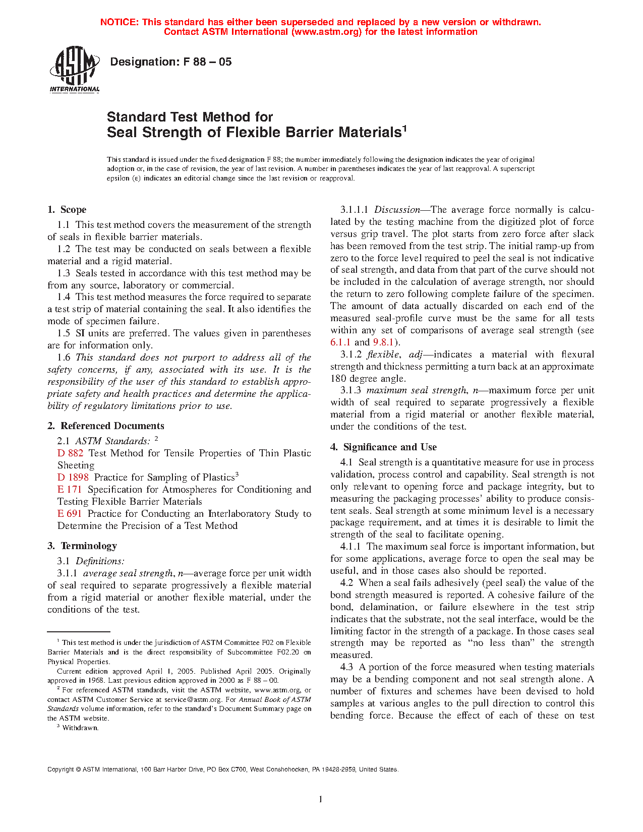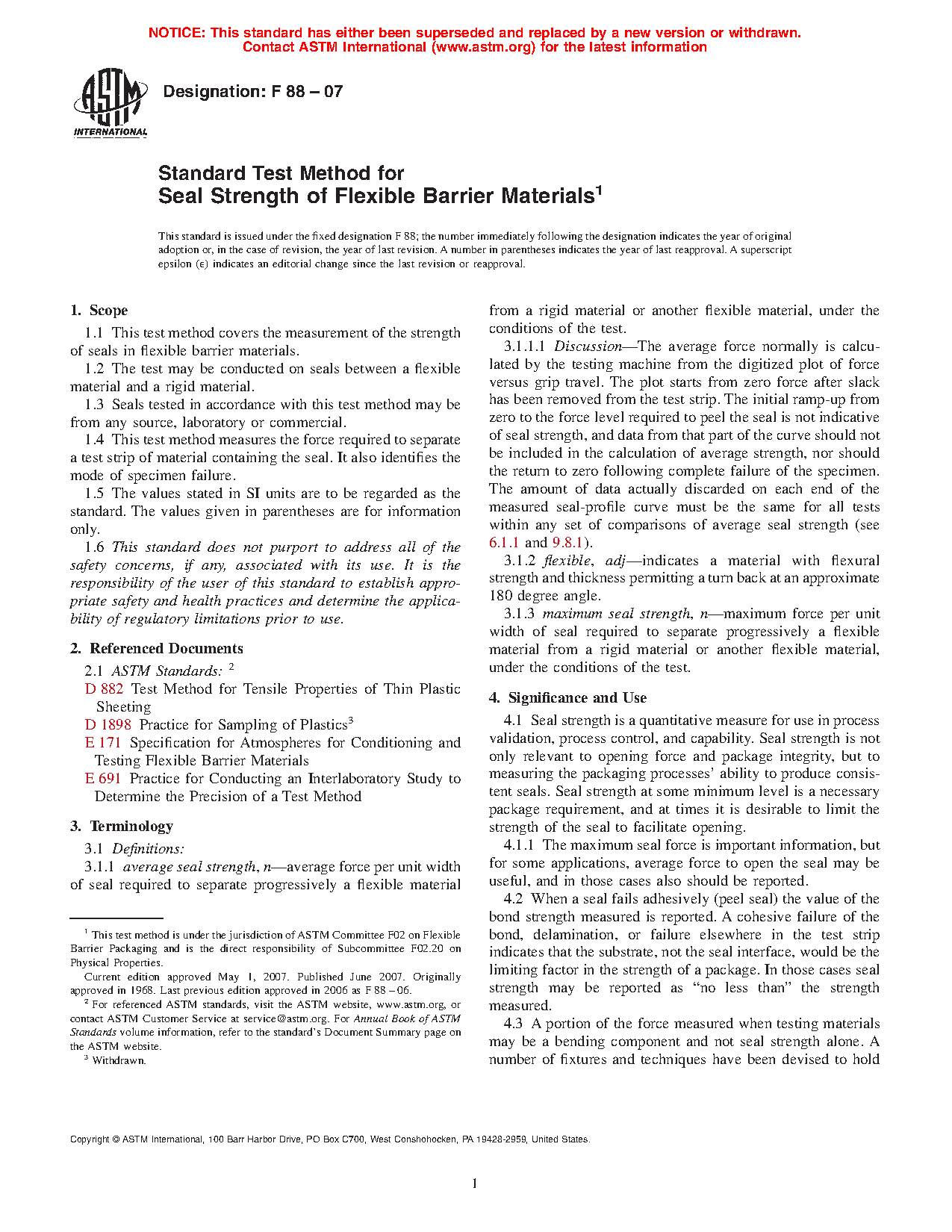 1.4 This test method measures the force required to separate a test strip of material containing the seal. It also identifies the mode of specimen failure.