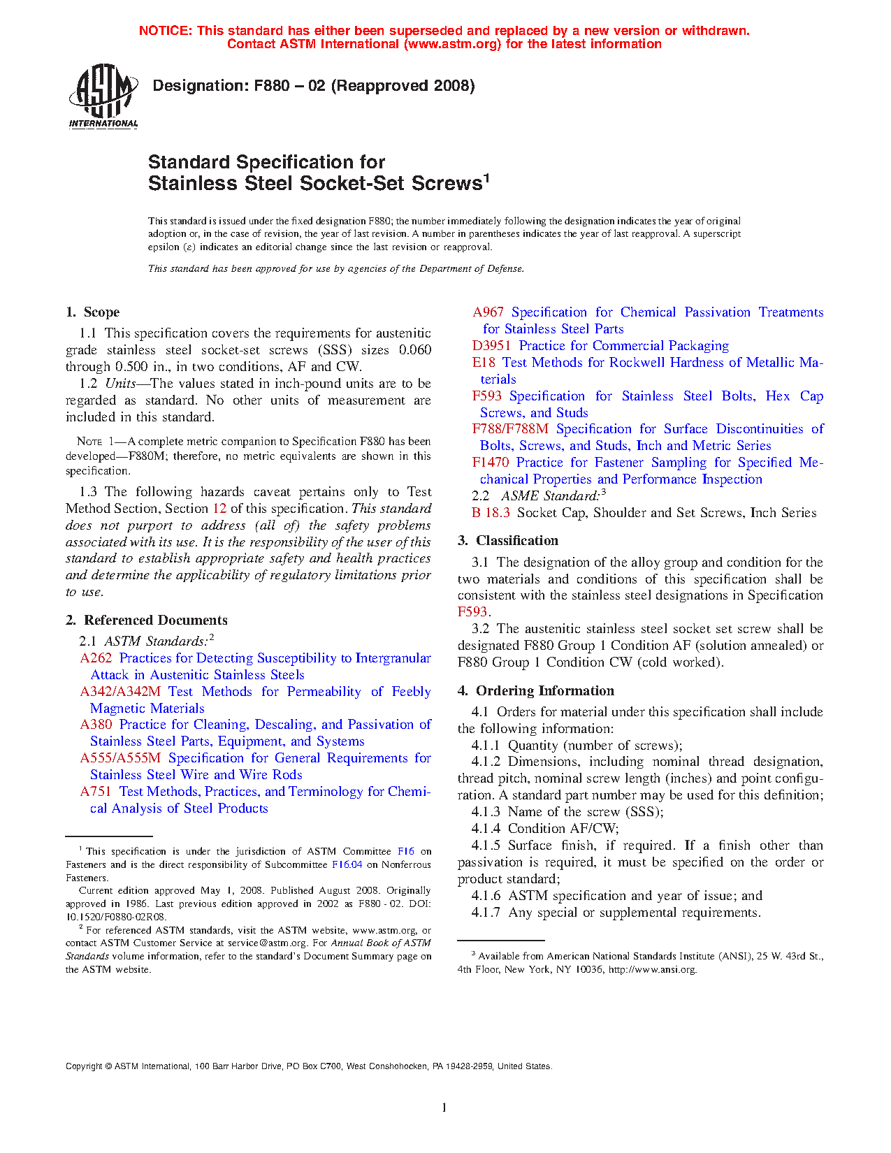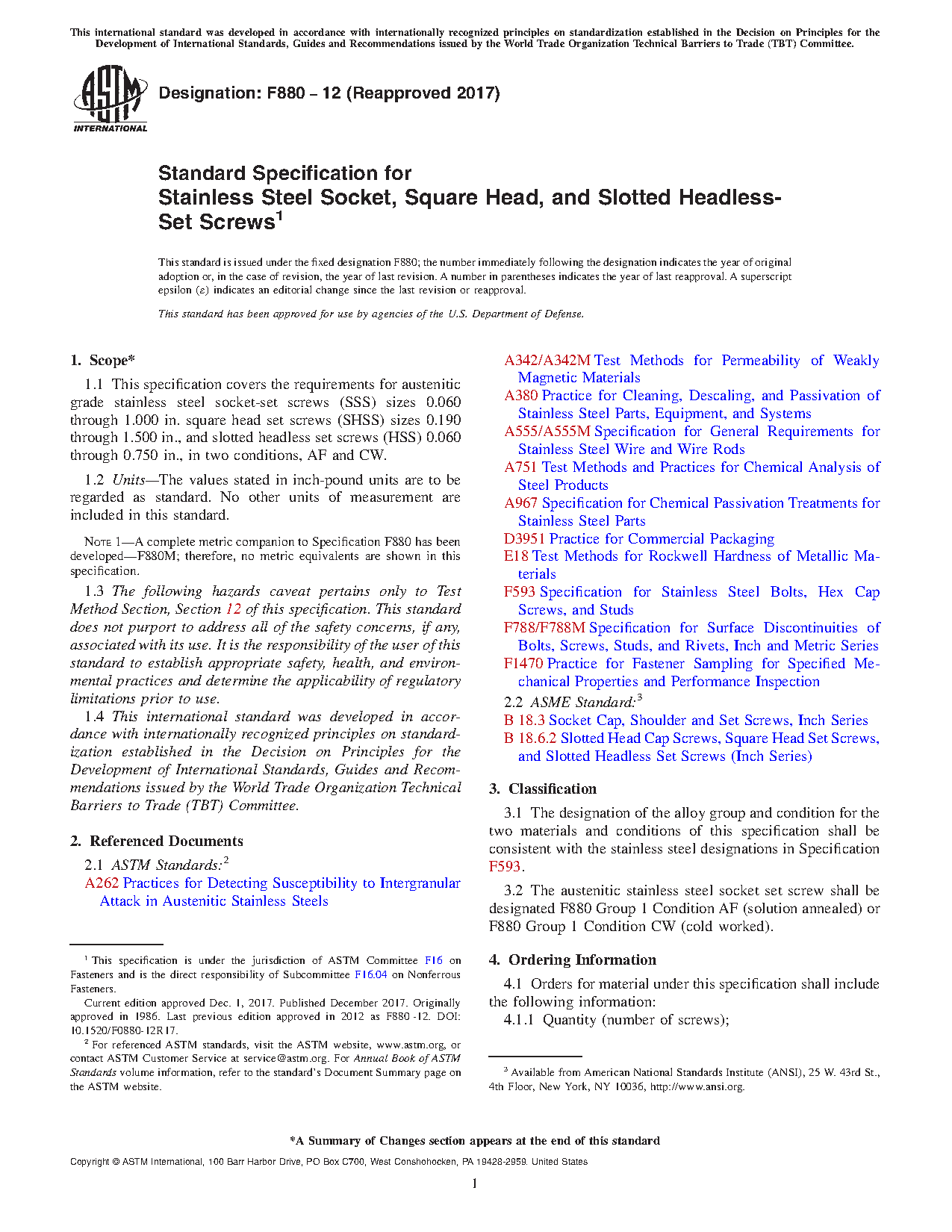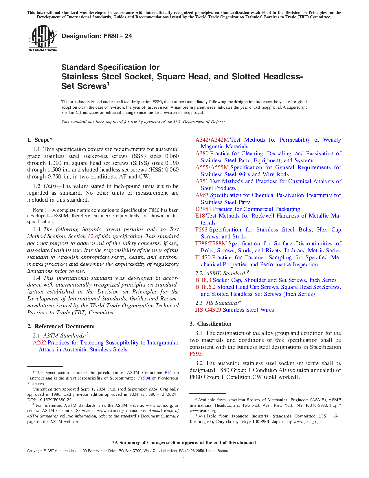 1.1 This specification covers the requirements for austenitic grade stainless steel socket-set screws (SSS) sizes 0.060 through 1.000 in. square head set screws (SHSS) sizes 0.190 through 1.500 in., and slotted headless set screws (HSS) 0.060 through 0.750 in., in two conditions, AF and CW.