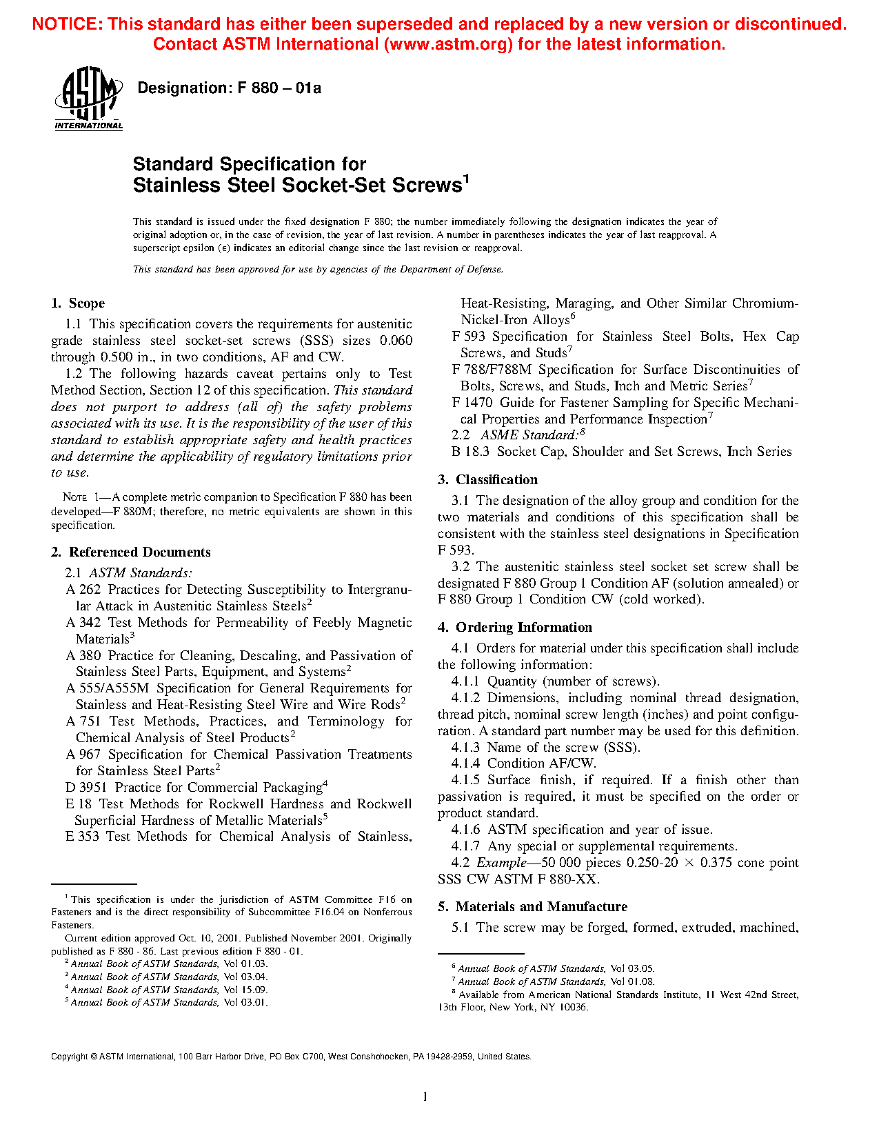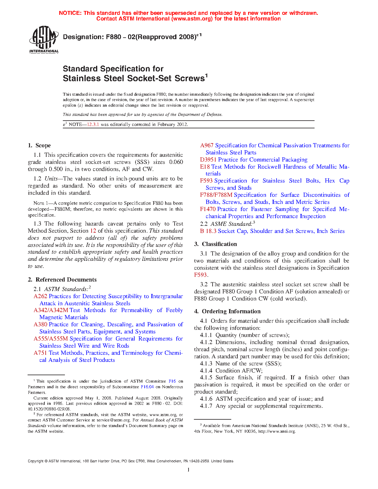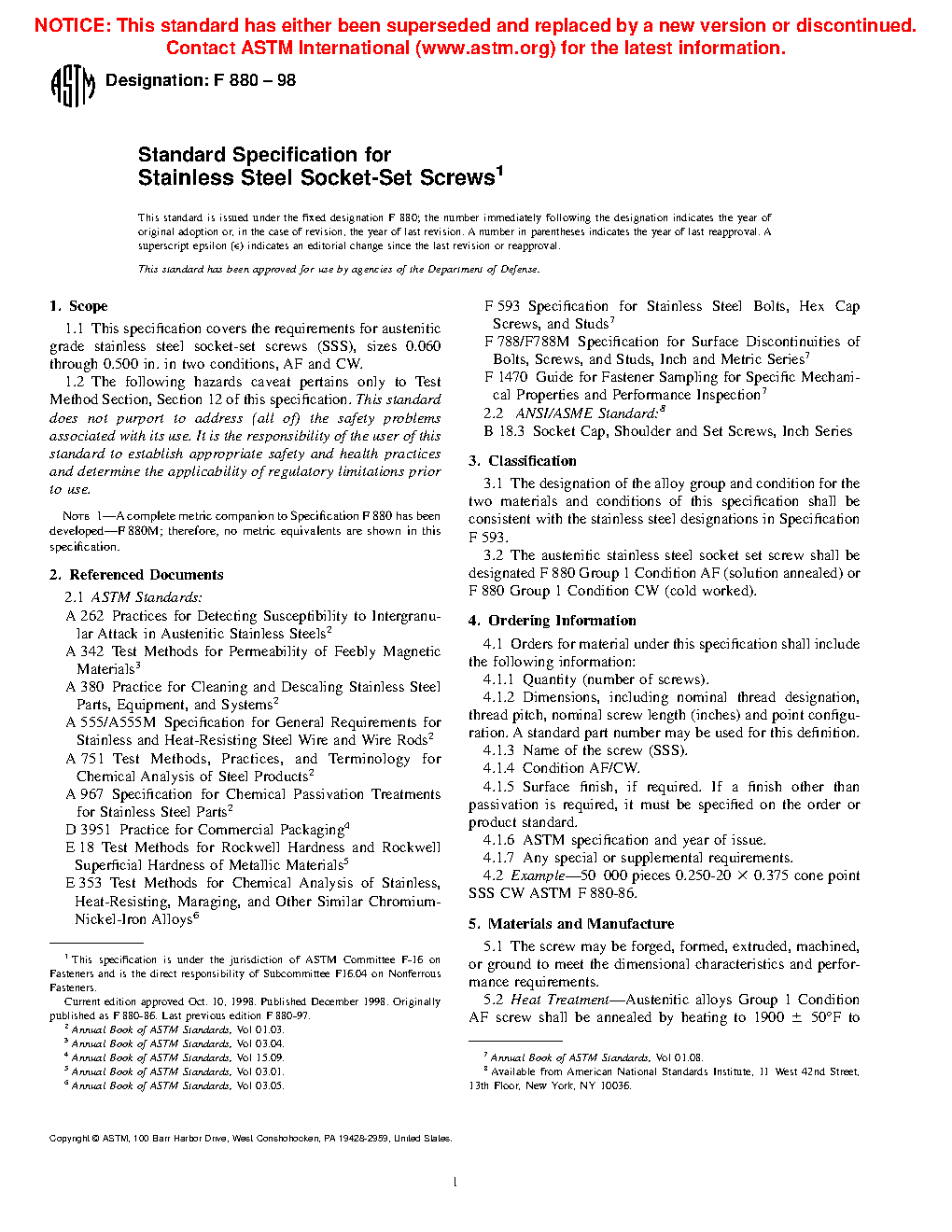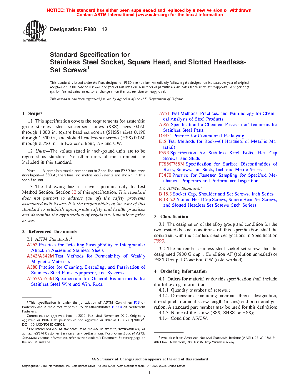 1.1 This specification covers the requirements for austenitic grade stainless steel socket-set screws (SSS) sizes 0.060 through 1.000 in. square head set screws (SHSS) sizes 0.190 through 1.500 in., and slotted headless set screws (HSS) 0.060 through 0.750 in., in two conditions, AF and CW.