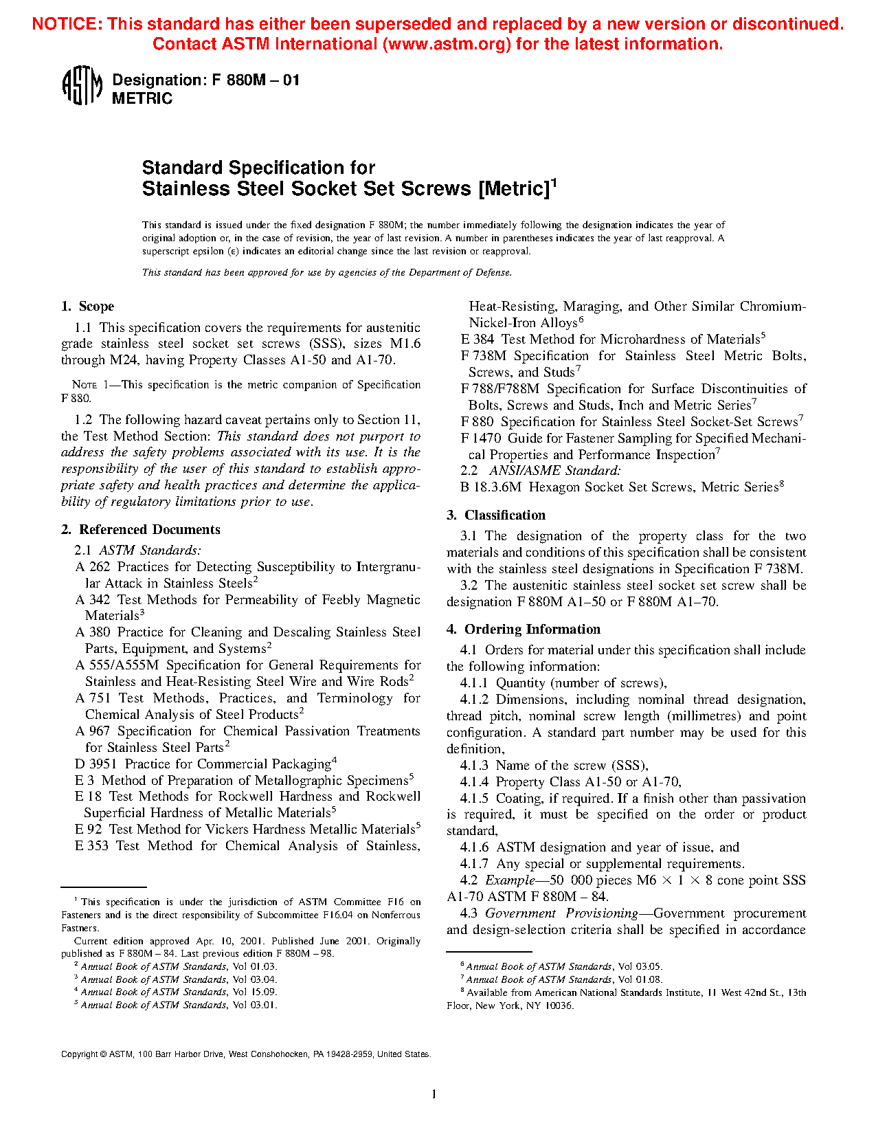 1.1 This specification covers the requirements for austenitic grade stainless steel socket set screws (SSS), sizes M1.6 through M24, having Property Classes A1-50 and A1-70.