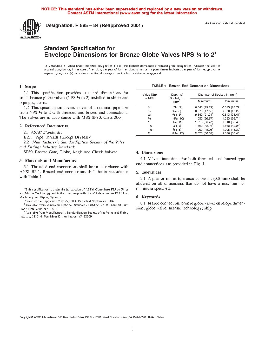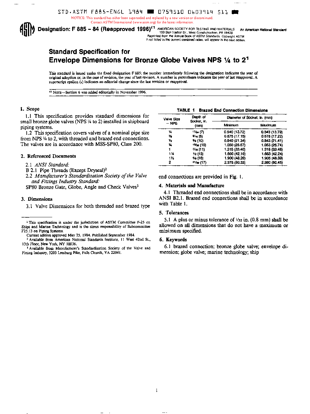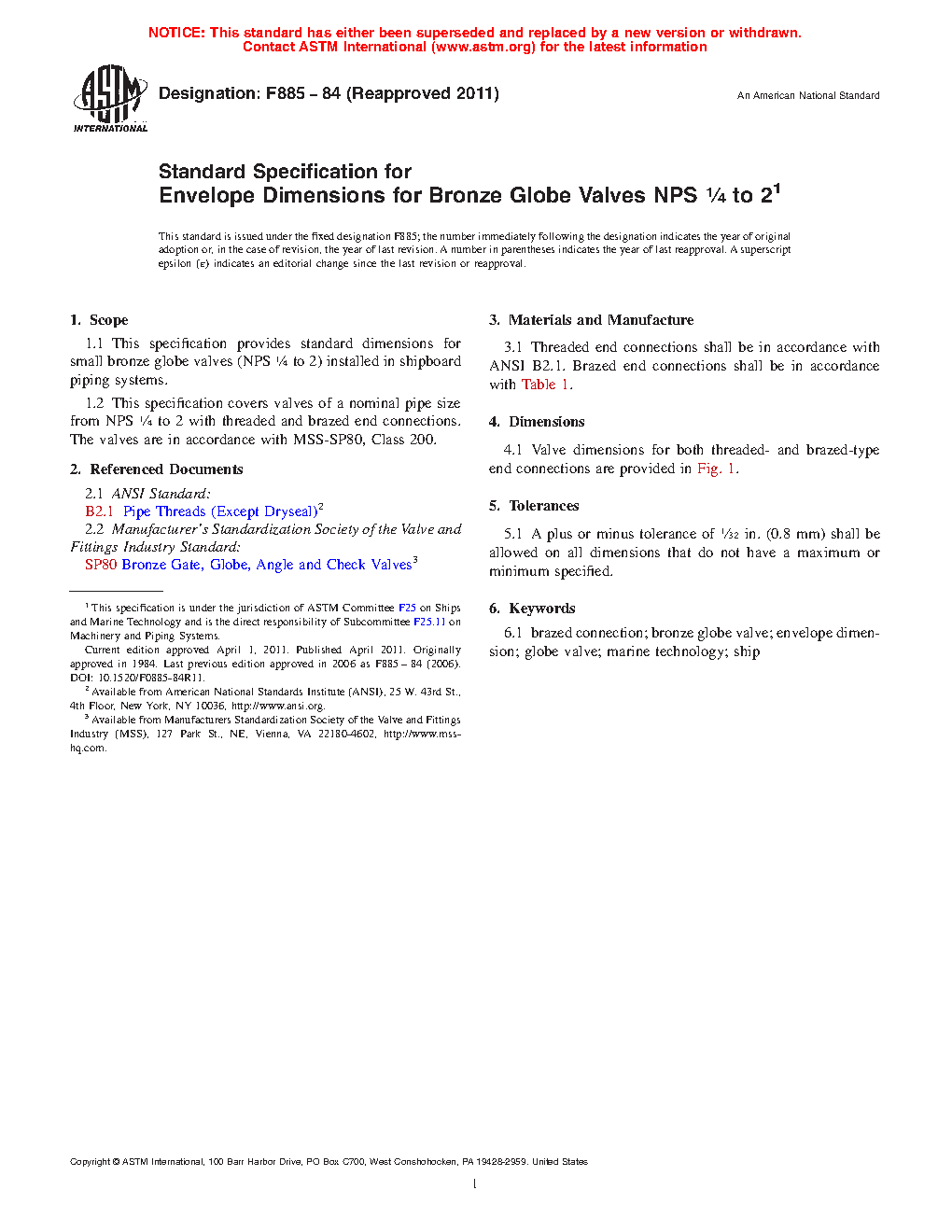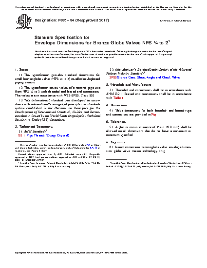 This specification supplies the standard envelope dimensions for small bronze globe valves of nominal pipe sizes from NPS ¼ to 2 with threaded and brazed end connections installed in shipboard piping systems. The valves are in accordance with MSS-SP80, Class 200.