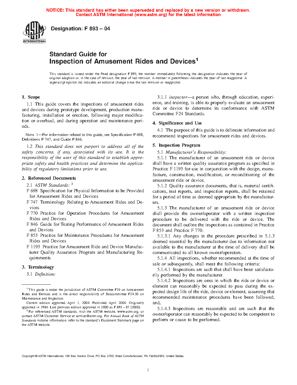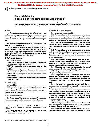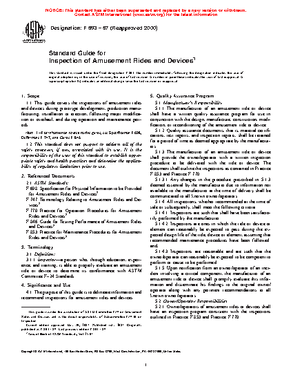 1.1 This guide covers the inspections of amusement rides and devices during prototype development, production manufacturing, installation or erection, following major modification or overhaul, and during operation and maintenance periods. Note 1 For information related to this guide, see Specification F 698, Terminology F 747, and Guide F 846.