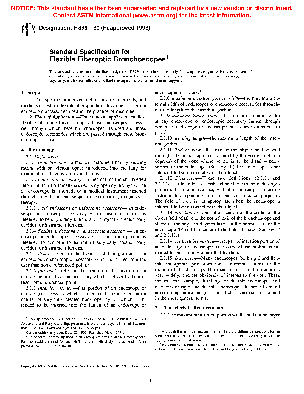 1.1 This specification covers definitions, requirements, and methods of test for flexible fiberoptic bronchoscope and certain endoscopic accessories used in the practice of medicine.