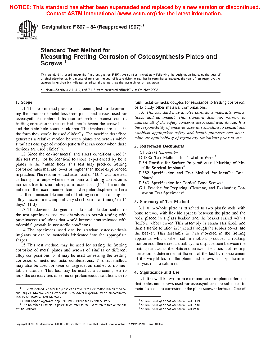1.2 Since the environmental and stress conditions used in this test may not be identical to those experienced by bone plates in the human body, this test may produce fretting corrosion rates that are lower or higher than those experienced in practice. The recommended axial load of 400 N was selected as being in a range where the amount of fretting corrosion is not sensitive to small changes in axial load (1). The combination of the recommended load and angular displacement are such that a measurable amount of fretting corrosion of surgical alloys occurs in a comparatively short period of time (7 to 14 days). (1-3)