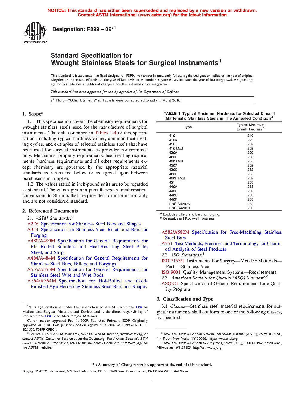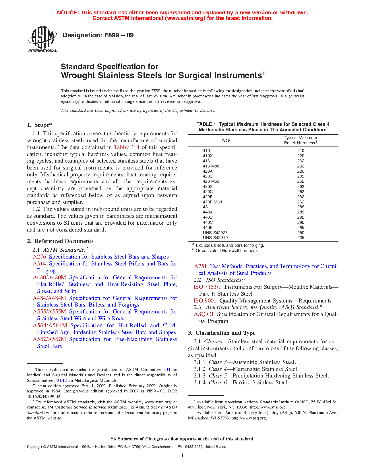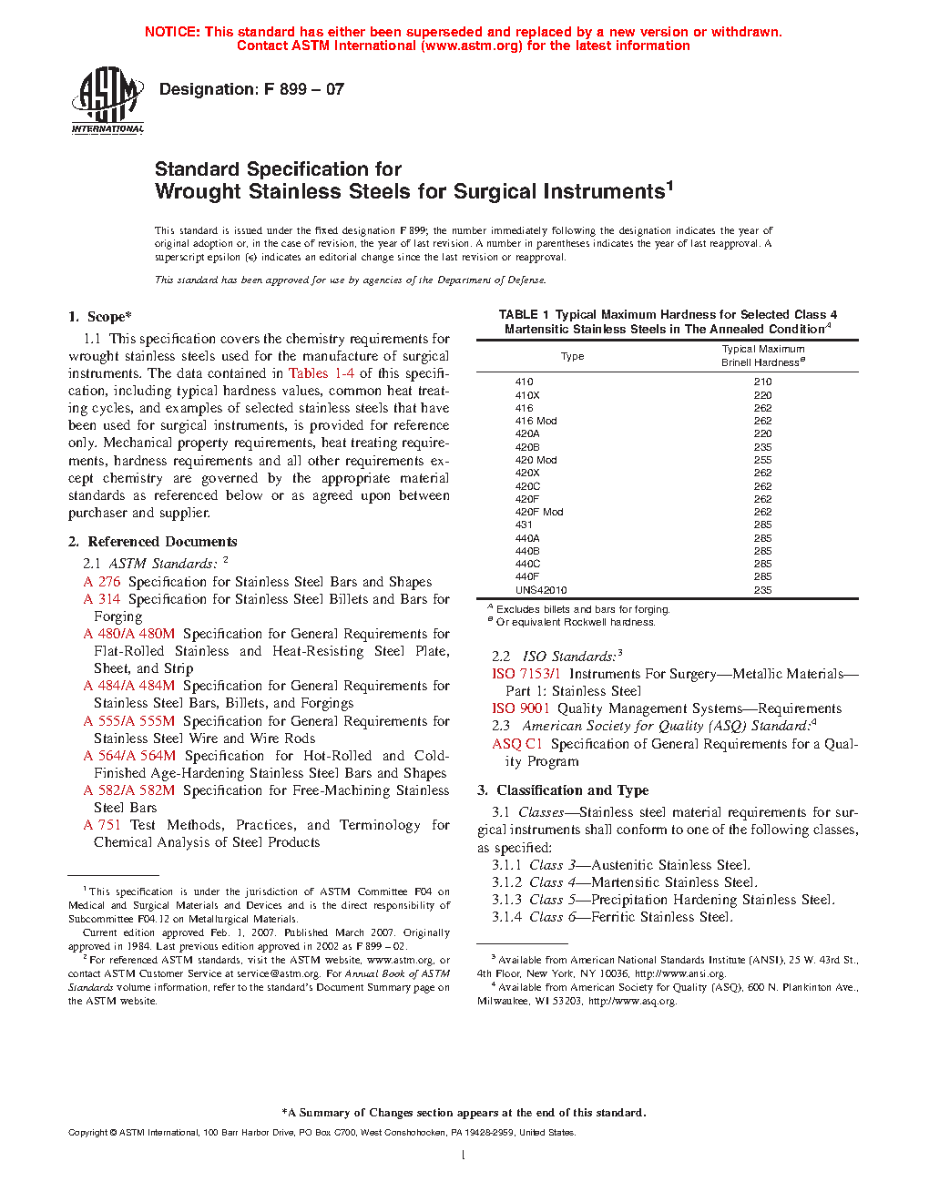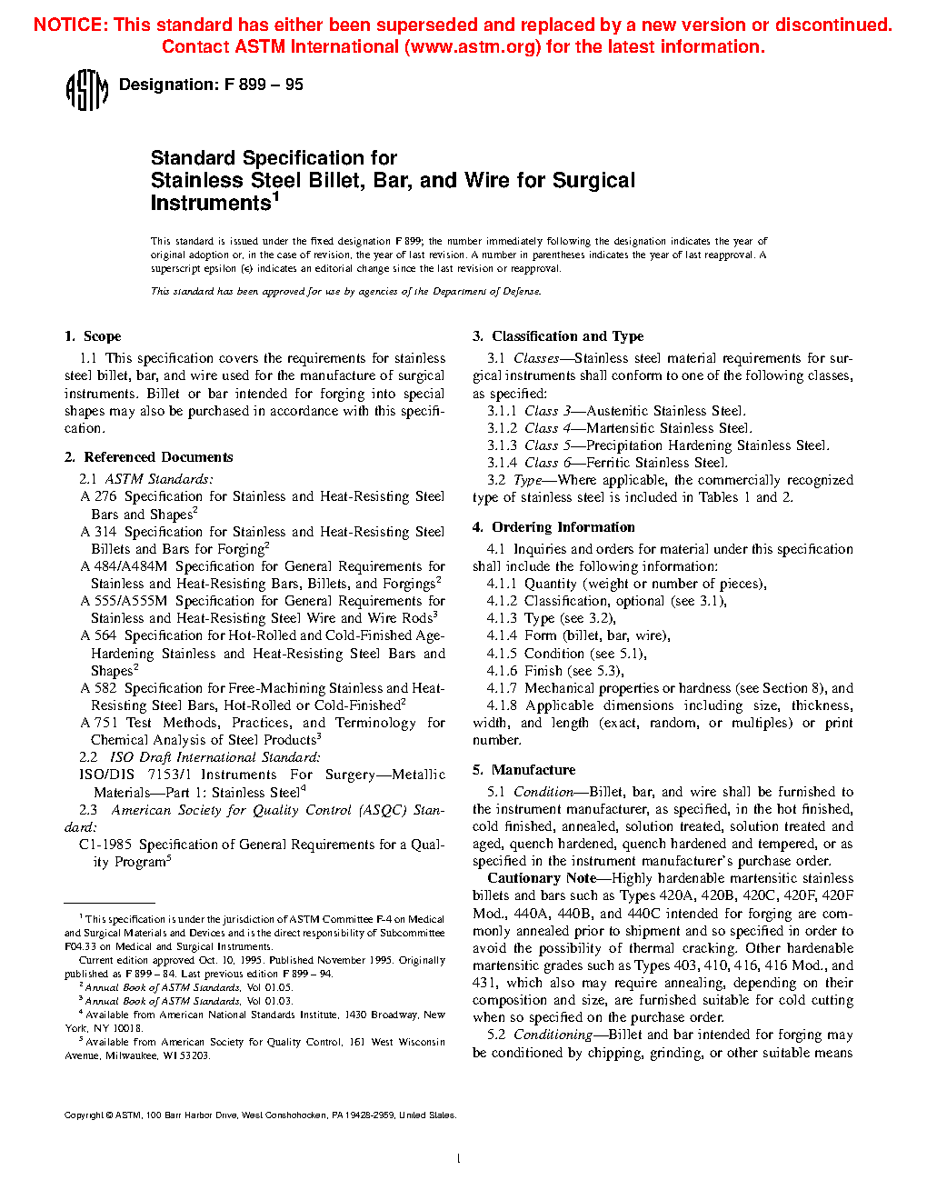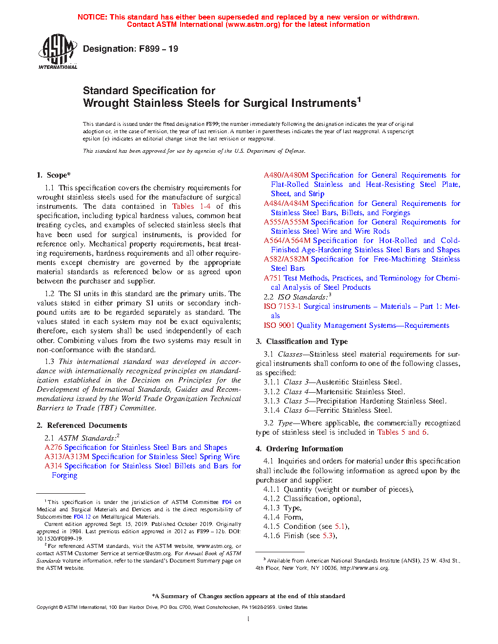 This specification covers the chemical requirements for wrought stainless steels used for the manufacture of surgical instruments. Classes of stainless steels covered here are Class 3 (austenitic stainless steel), Class 4 (martensitic stainless steel), Class 5 (precipitation hardening stainless steel), and Class 6 (ferritic stainless steel). The data contained in this specification, such as typical hardness values, common heat treating cycles, and examples of selected stainless steels that have been used for surgical instruments, are provided for reference only. Mechanical property, heat treatment, hardness, and all other requirements except for chemical composition, are governed by the appropriate material standards as specified or as agreed upon between purchaser and supplier.