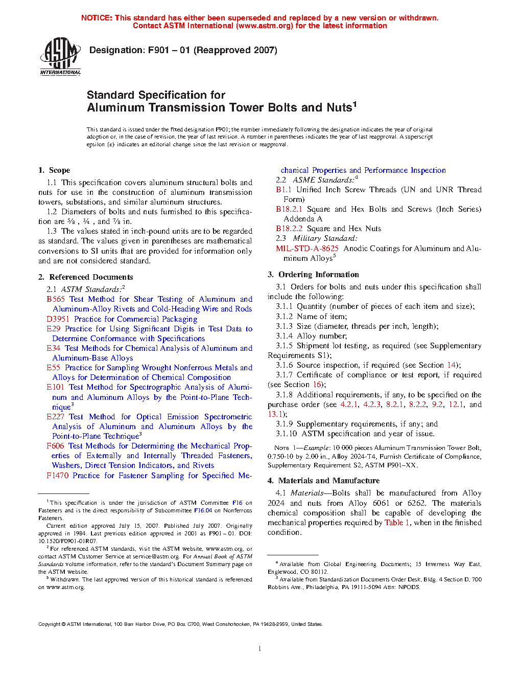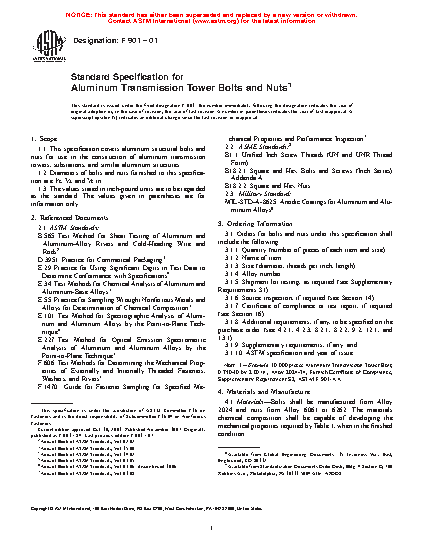 This specification covers aluminum transmission tower bolts and nuts. Bolts shall be manufactured from alloy 2024 and nuts from alloy 6061 or 6262, and shall be cold formed, hot formed, or machined formed. Alloy materials for bolts and nuts shall conform to the chemical requirements of this specification. Bolts and nuts shall conform to the required tensile strength, dimensions, workmanship, finish, appearance, marking, packaging, and shipping. Test methods shall include chemical analysis, wedge tension test, shear test, and proof-stress test.