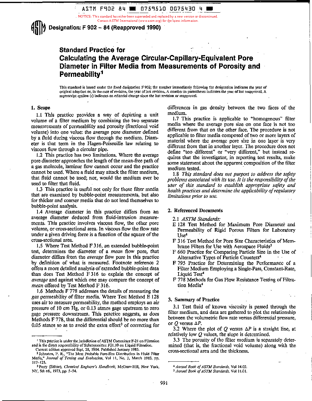 1.2 This practice has two limitations. Where the average pore diameter approaches the length of the mean-free path of a gas molecule, laminar flow cannot occur and the practice cannot be used. Where a fluid may attack the filter medium, that fluid cannot be used; nor, would the medium ever be used to filter that fluid.