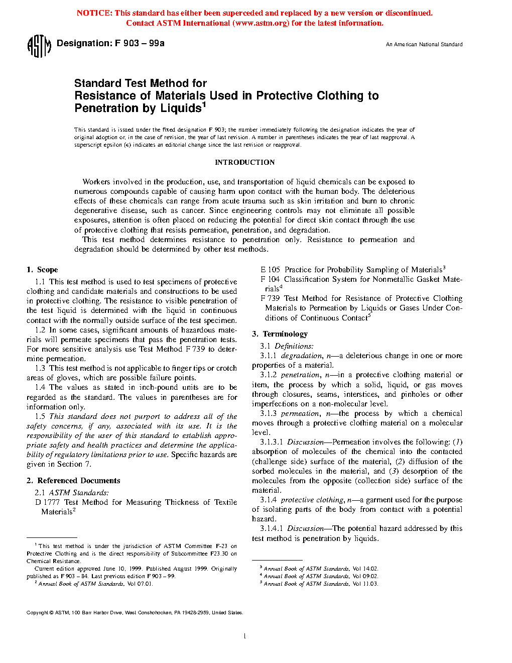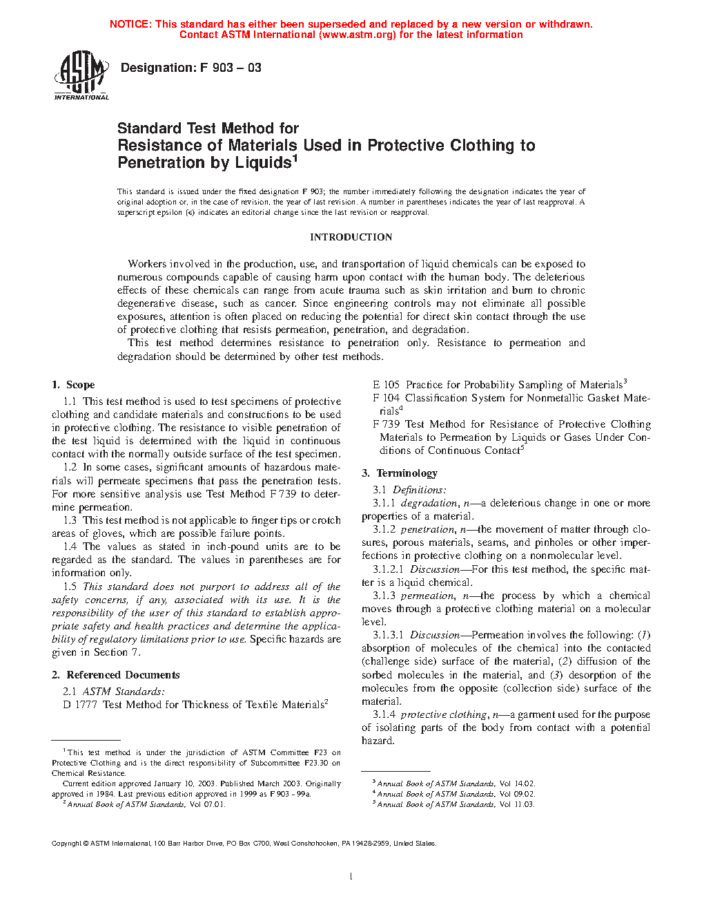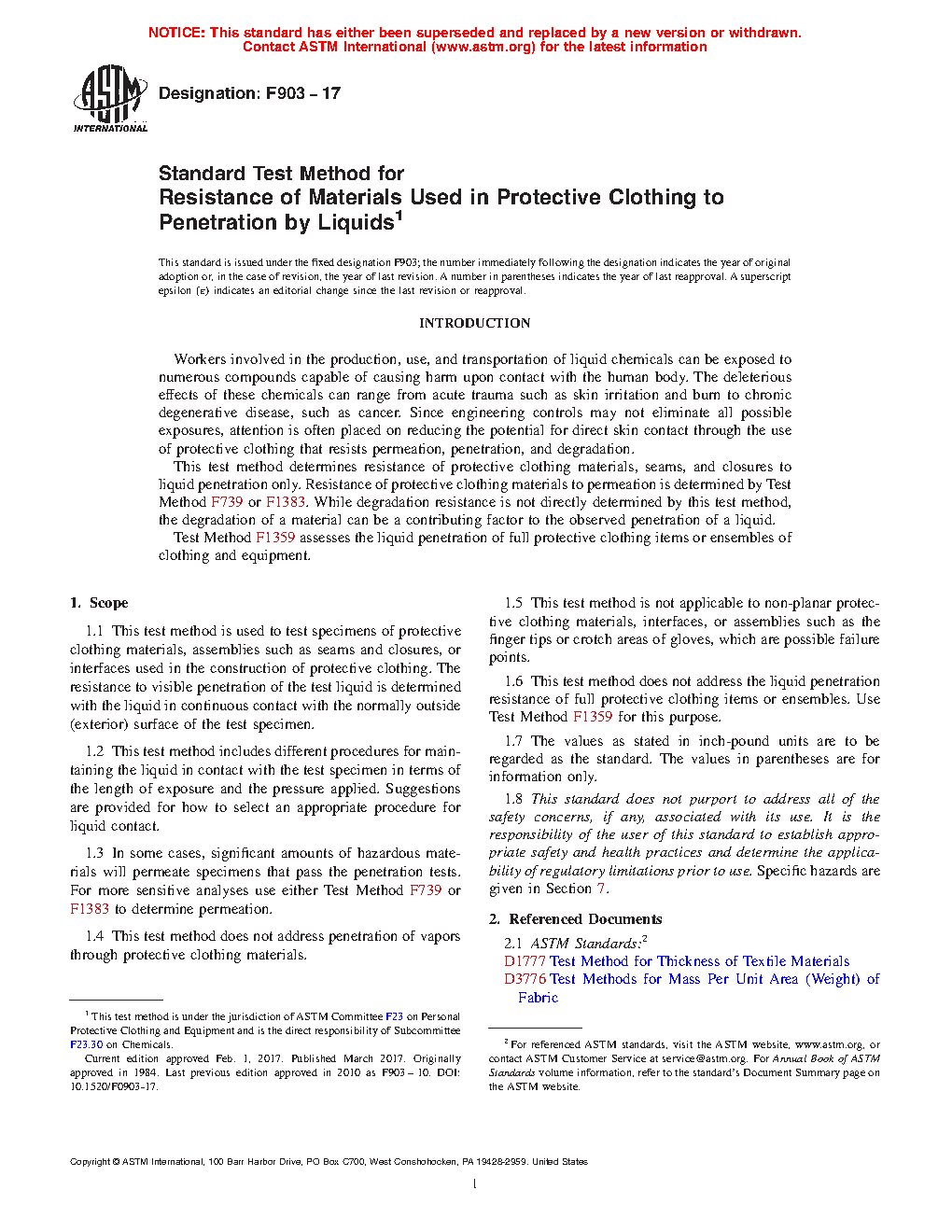 1.6 This test method does not address the liquid penetration resistance of full protective clothing items or ensembles. Use Test Method F1359 for this purpose.
