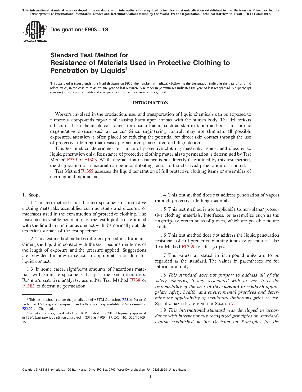 5.10 This test method does not address the liquid penetration of full protective clothing or ensembles. Use Test Method F1359 to provide a complete evaluation of the liquid integrity of protective clothing or ensembles, particularly areas of the clothing or ensembles that cannot be directly assessed by this test method such as interface areas between different items of clothing and equipment.