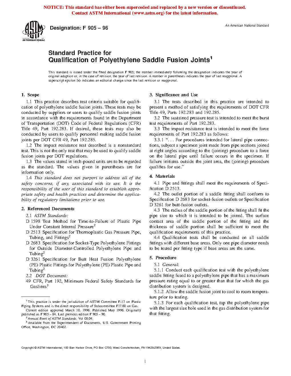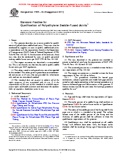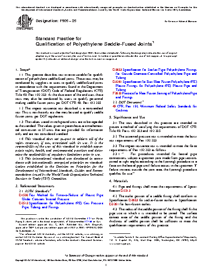 1.1 This practice describes test criteria suitable for qualification of polyethylene saddle-fused joints. These tests may be conducted by suppliers or users to qualify saddle-fused joints in accordance with the requirements found in the Department of Transportation (DOT) Code of Federal Regulations (CFR) Title 49, Part 192.283. At the discretion of the end user, these tests may also be conducted by users to qualify personnel making saddle fusion joints per DOT CFR 49, Part 192.285.