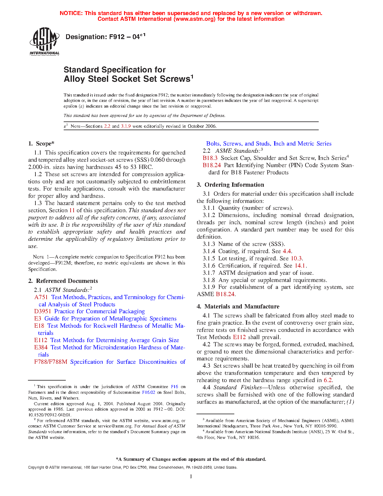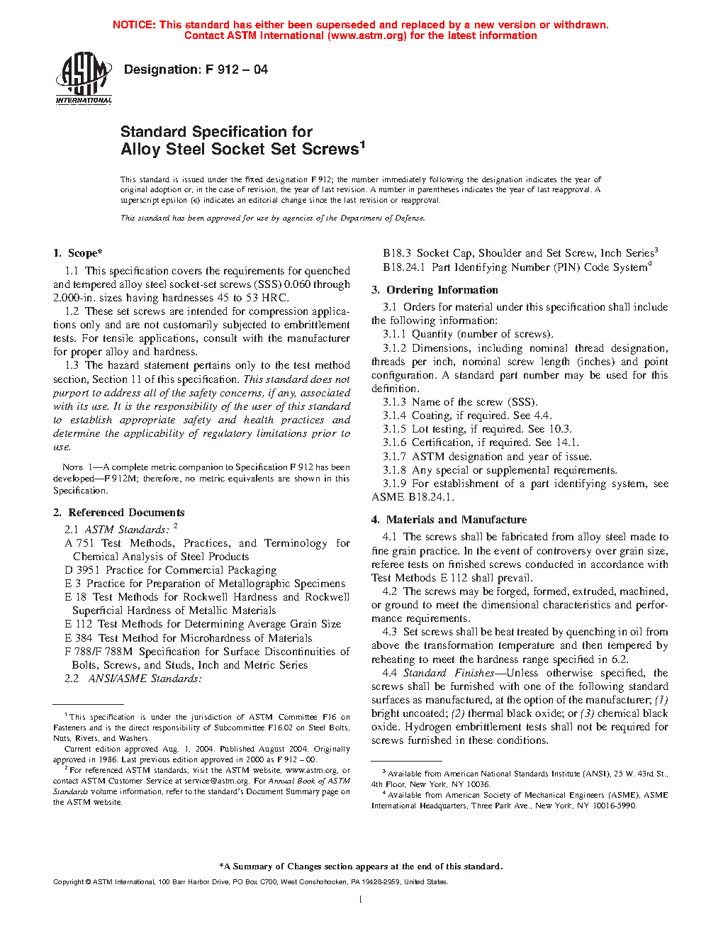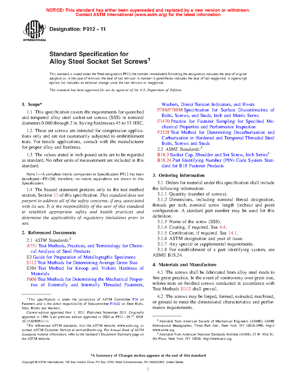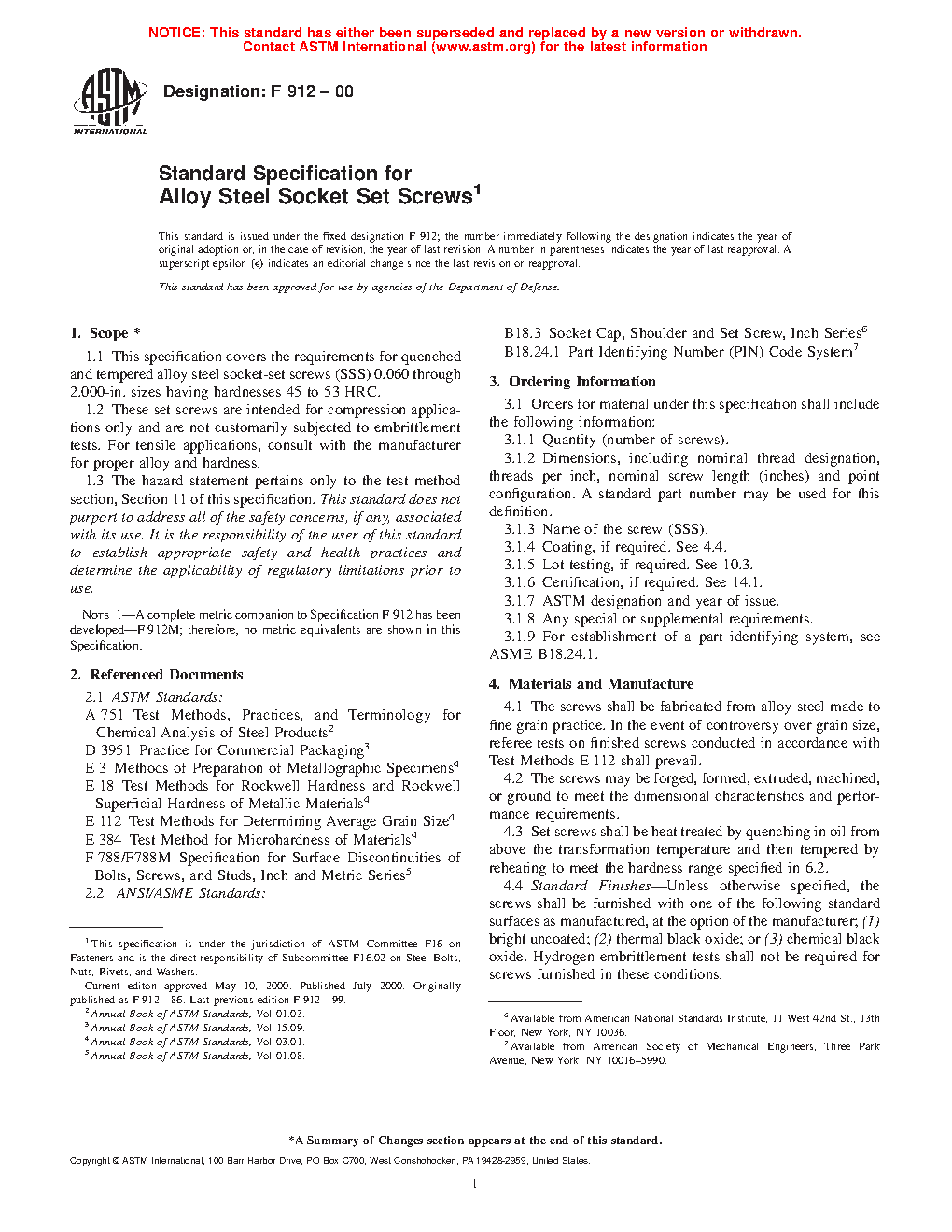 1.1 This specification covers the requirements for quenched and tempered alloy steel socket-set screws (SSS) in nominal diameters 0.060 through 2 in. having hardnesses 45 to 53 HRC.