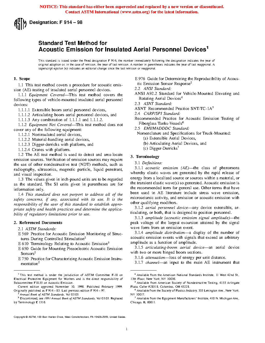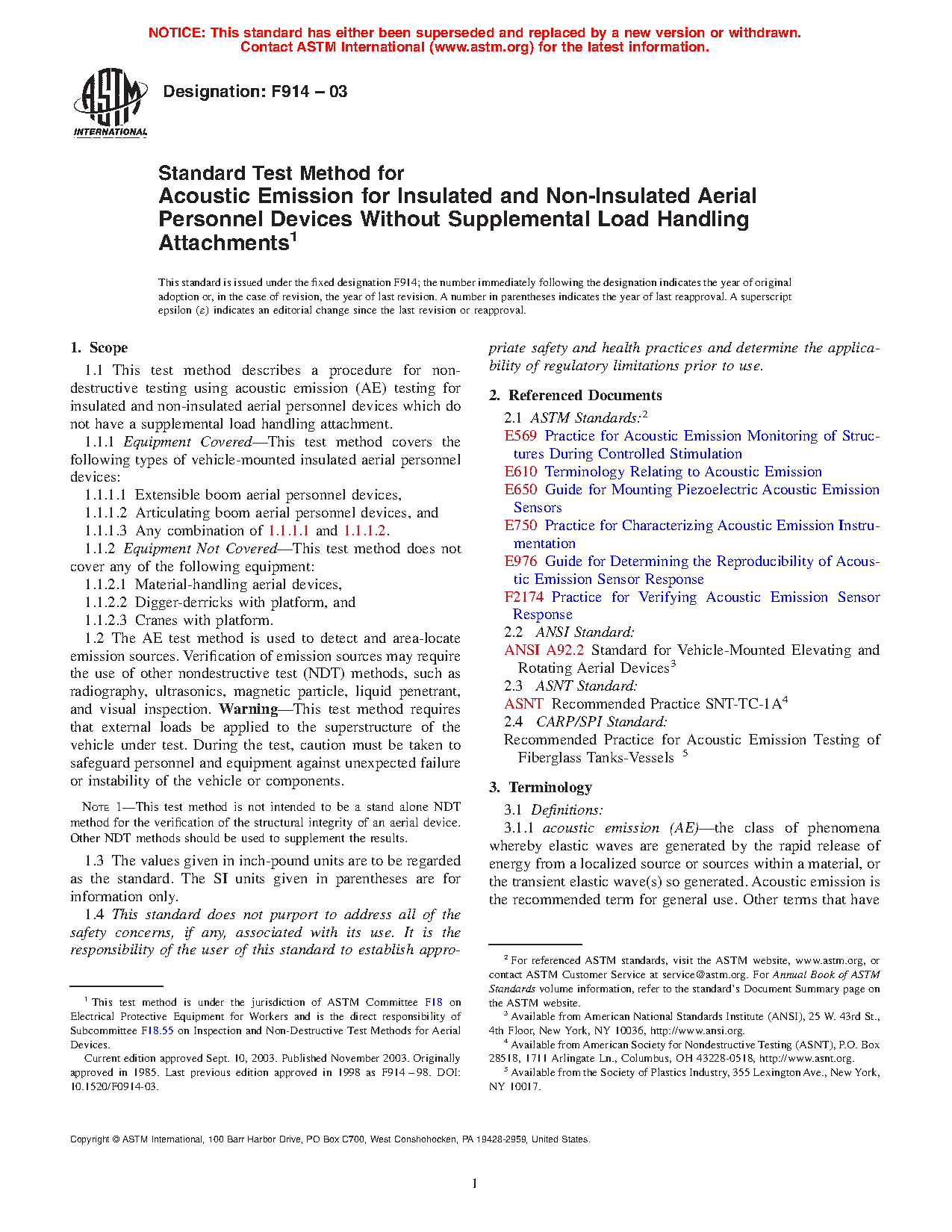 1.1 This test method describes a procedure for non-destructive testing using acoustic emission (AE) testing for insulated and non-insulated aerial personnel devices which do not have a supplemental load handling attachment.