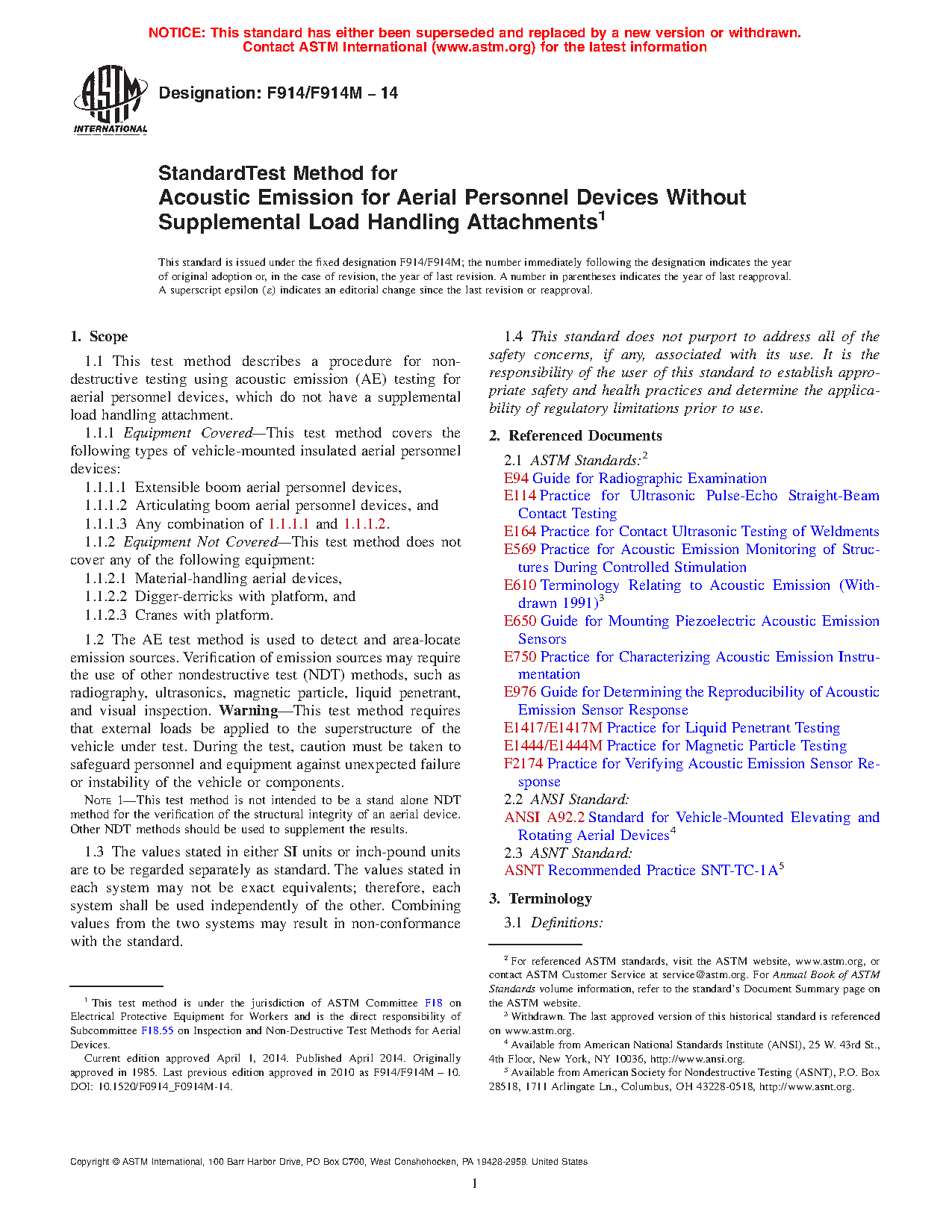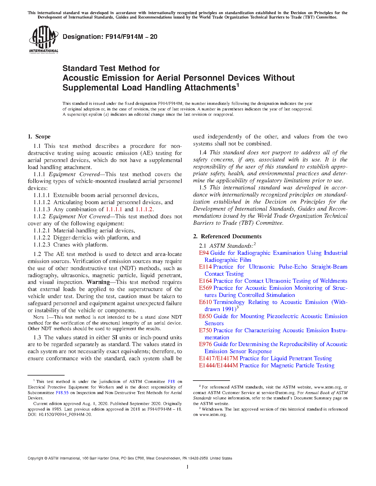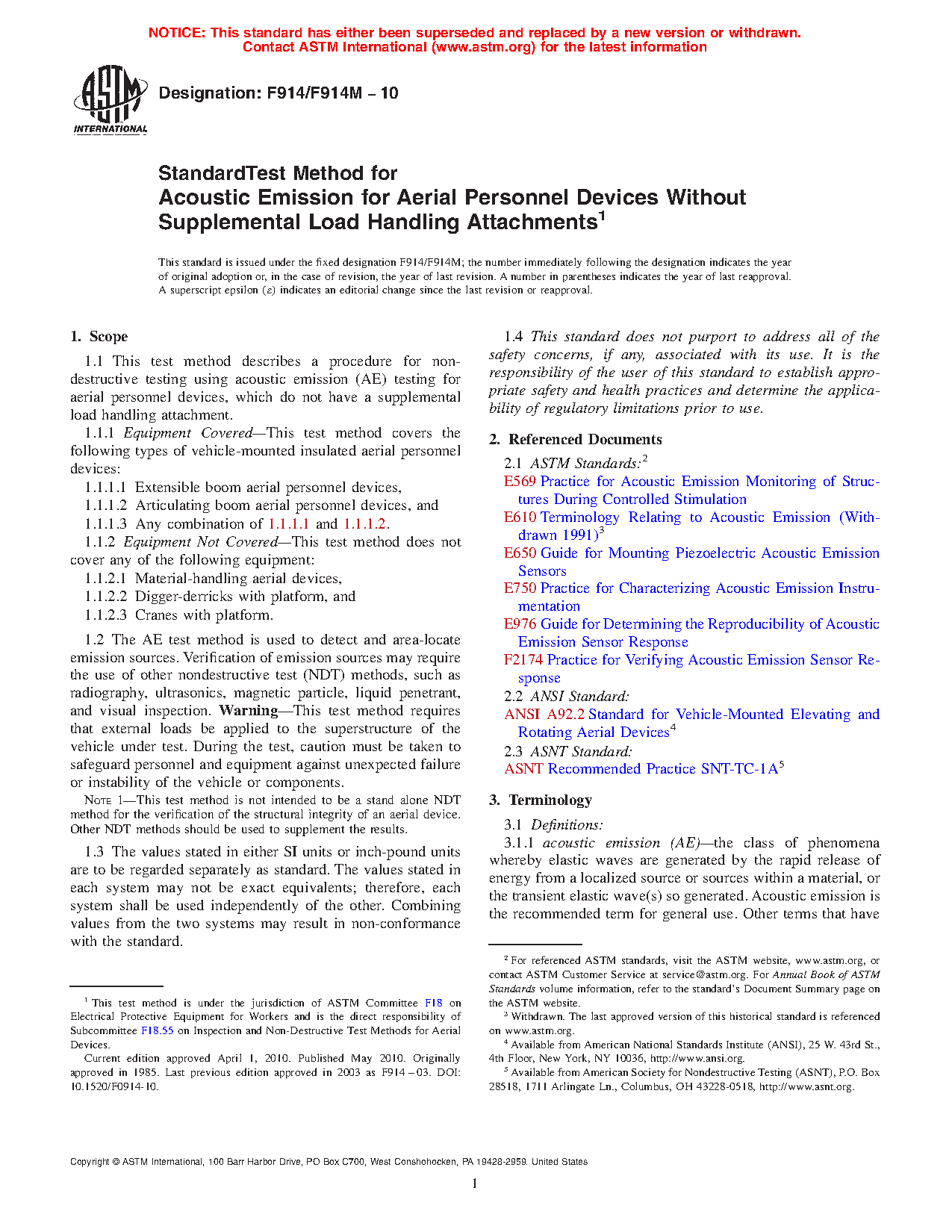 1.1 This test method describes a procedure for non-destructive testing using acoustic emission (AE) testing for aerial personnel devices, which do not have a supplemental load handling attachment.