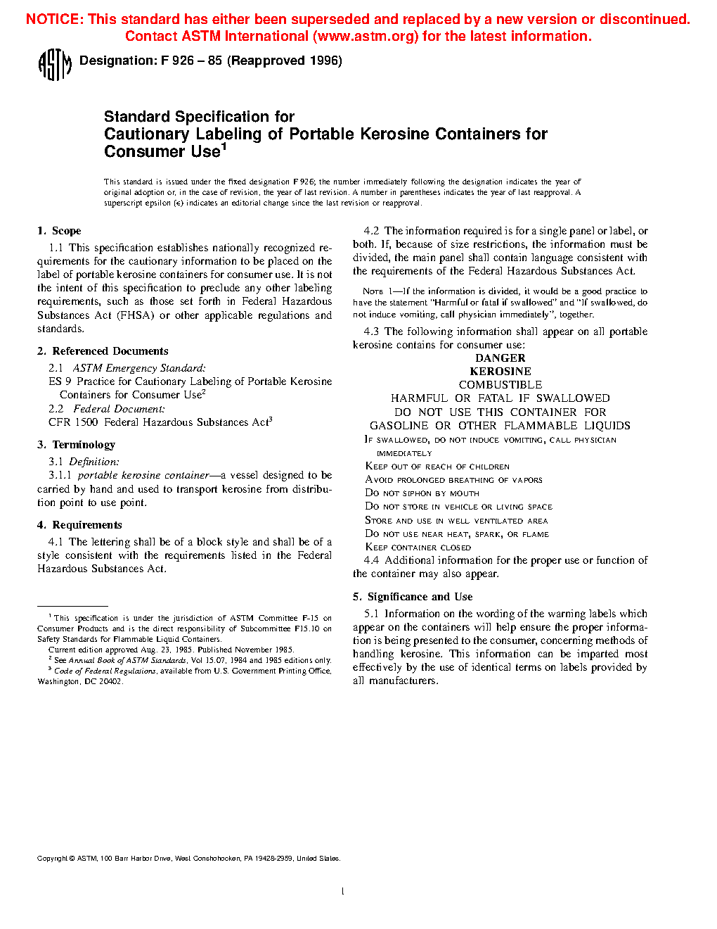1.1 This specification establishes nationally recognized requirements for the cautionary information to be placed on the label of portable kerosine and diesel containers for consumer use. It is not the intent of this specification to preclude any other labeling requirements, such as those set forth in Federal Hazardous Substances Act (FHSA) or other applicable regulations and standards.