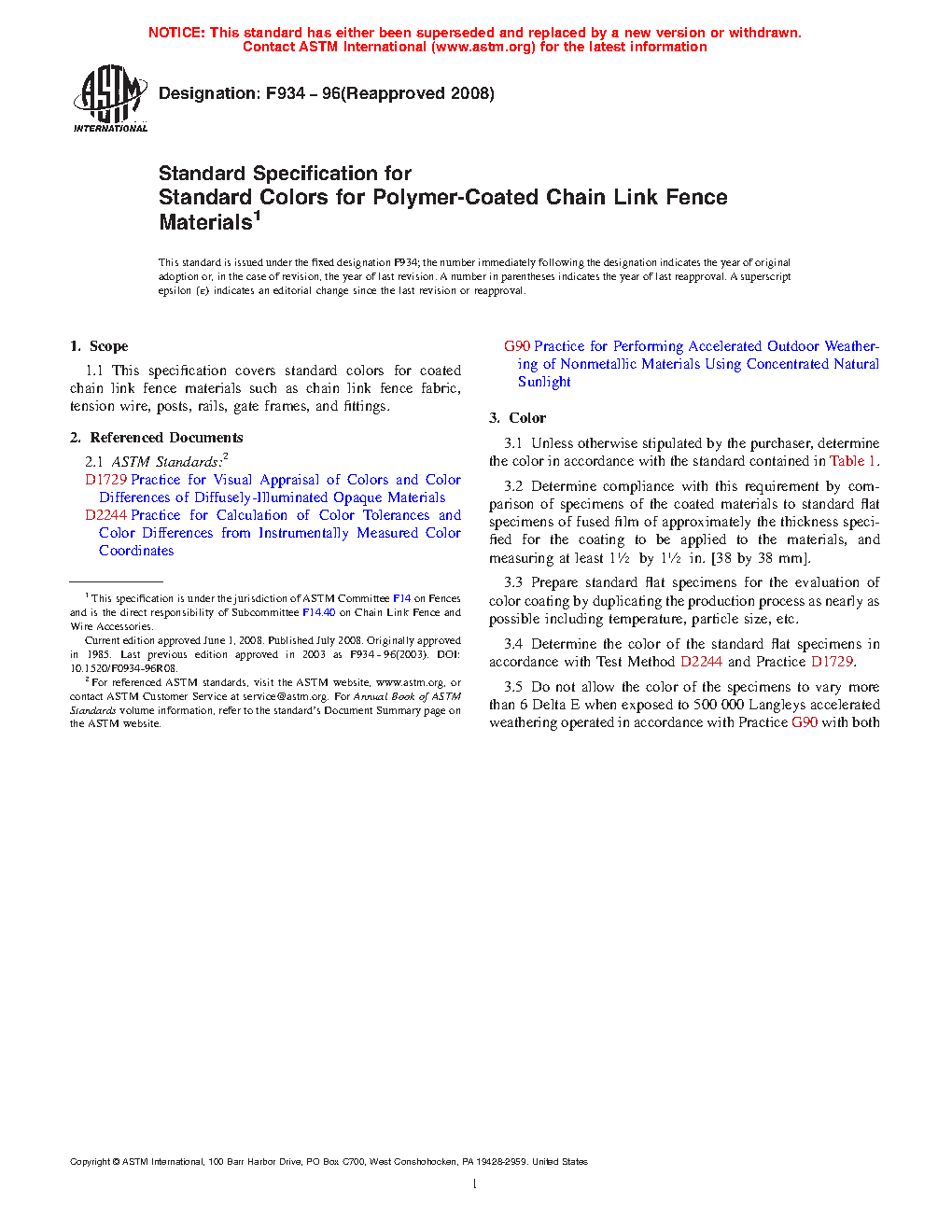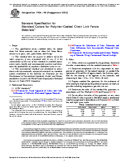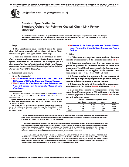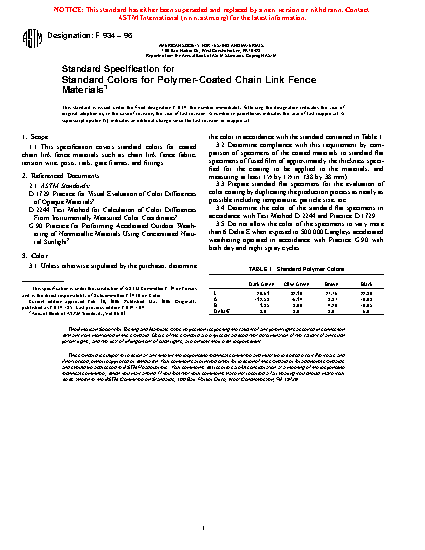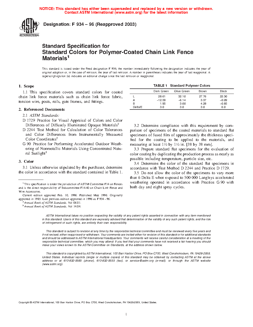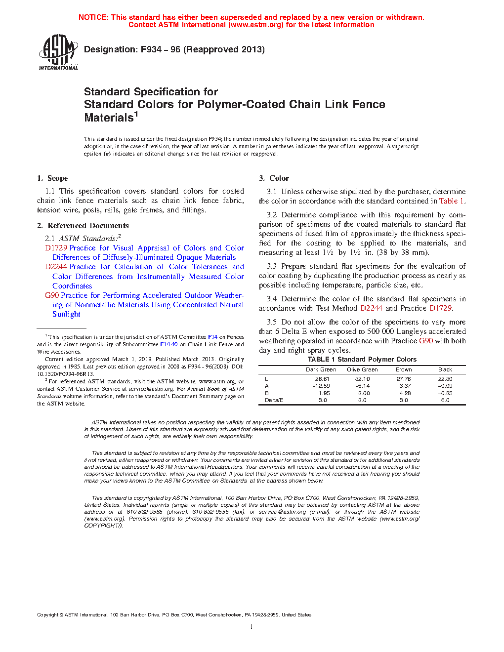 1.1 This specification covers standard colors for coated chain link fence materials such as chain link fence fabric, tension wire, posts, rails, gate frames, and fittings.