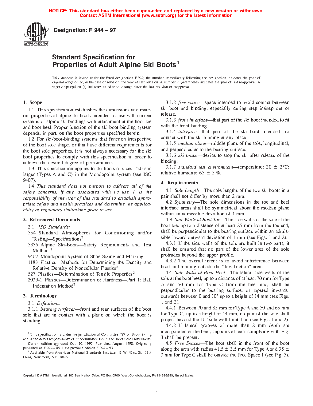 1.1 This specification establishes the dimensions and material properties of alpine ski boots intended for use with current systems of alpine ski bindings with attachment at the boot toe and boot heel. Proper function of the ski-boot-binding system depends, in part, on the boot properties specified herein.