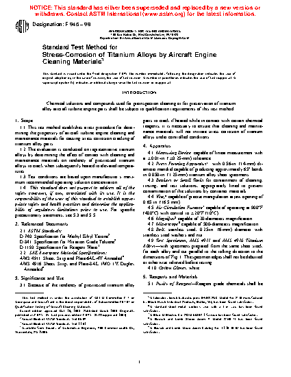 1.1 This test method establishes a test procedure for determining the propensity of aircraft turbine engine cleaning and maintenance materials for causing stress corrosion cracking of titanium alloy parts.