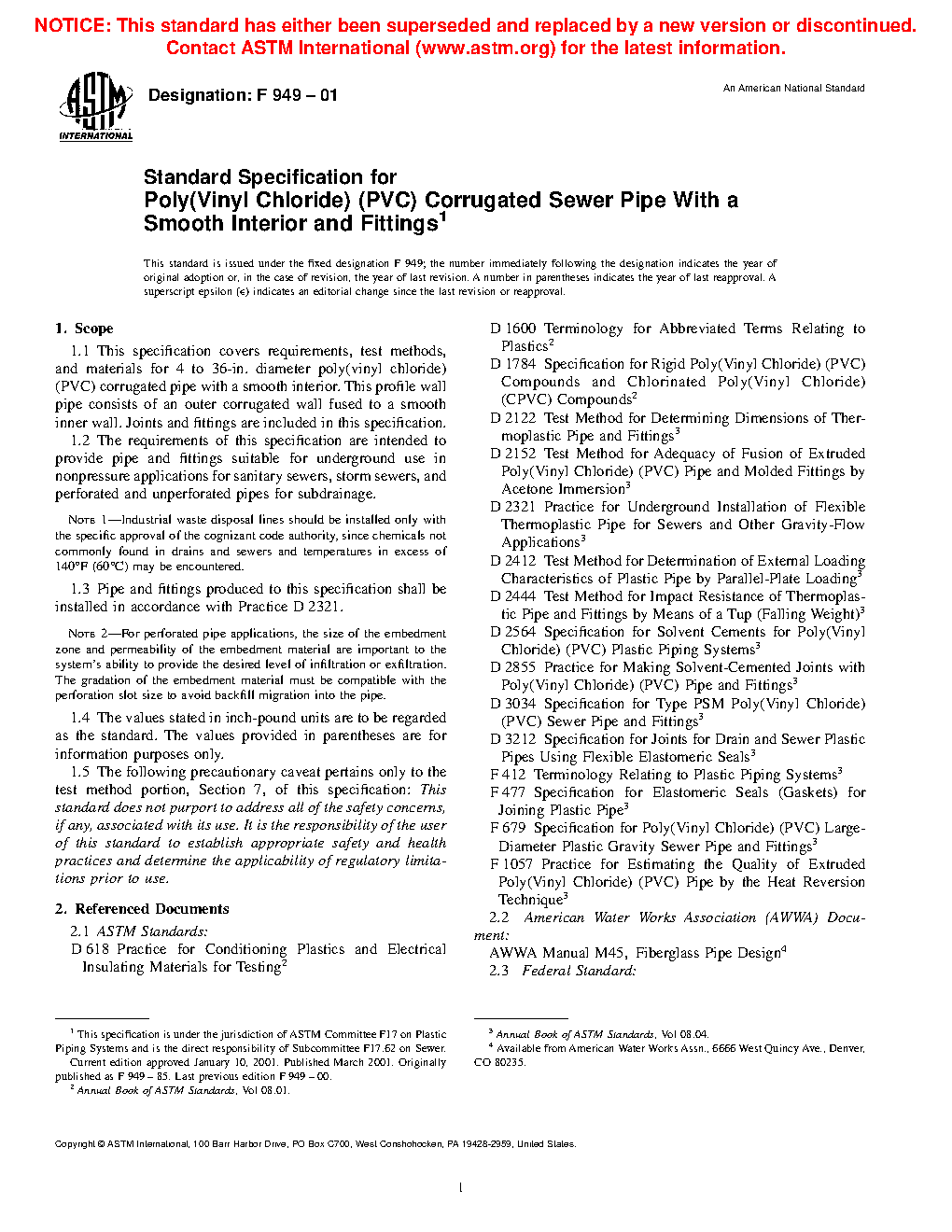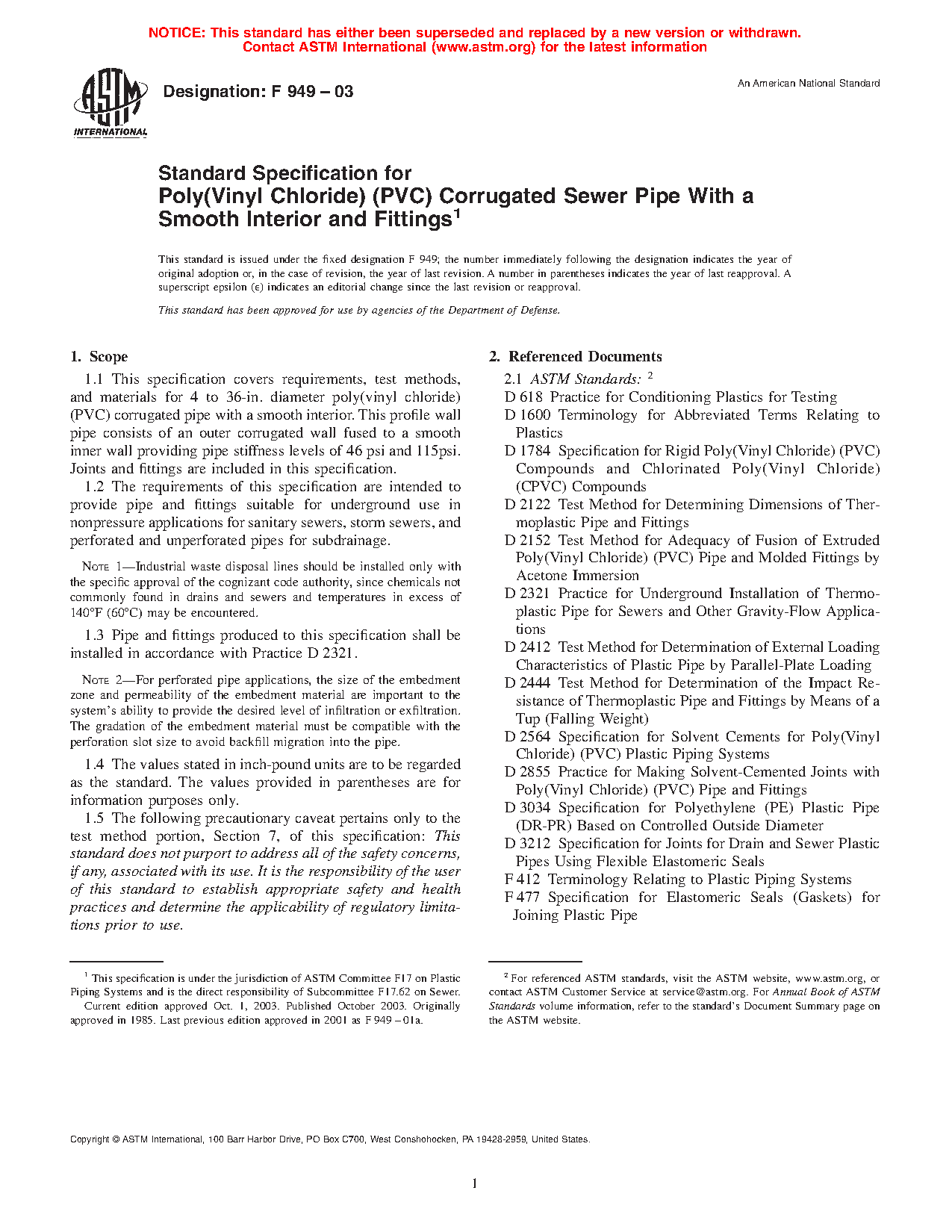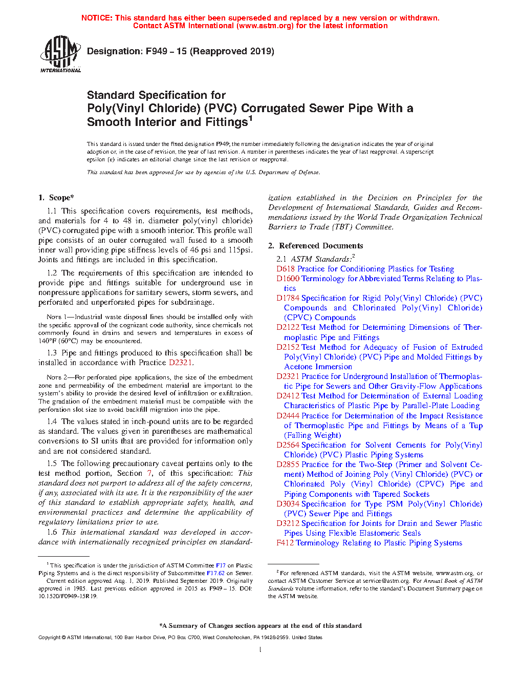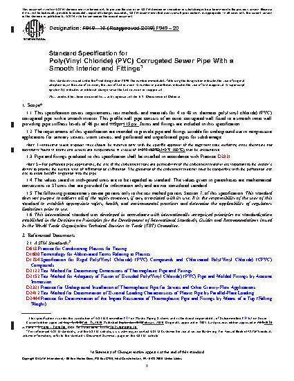 1.1 This specification covers requirements, test methods, and materials for 4 to 36-in. diameter poly(vinyl chloride) (PVC) corrugated pipe with a smooth interior. This profile wall pipe consists of an outer corrugated wall fused to a smooth inner wall providing pipe stiffness levels of 46 psi and 115psi. Joints and fittings are included in this specification.