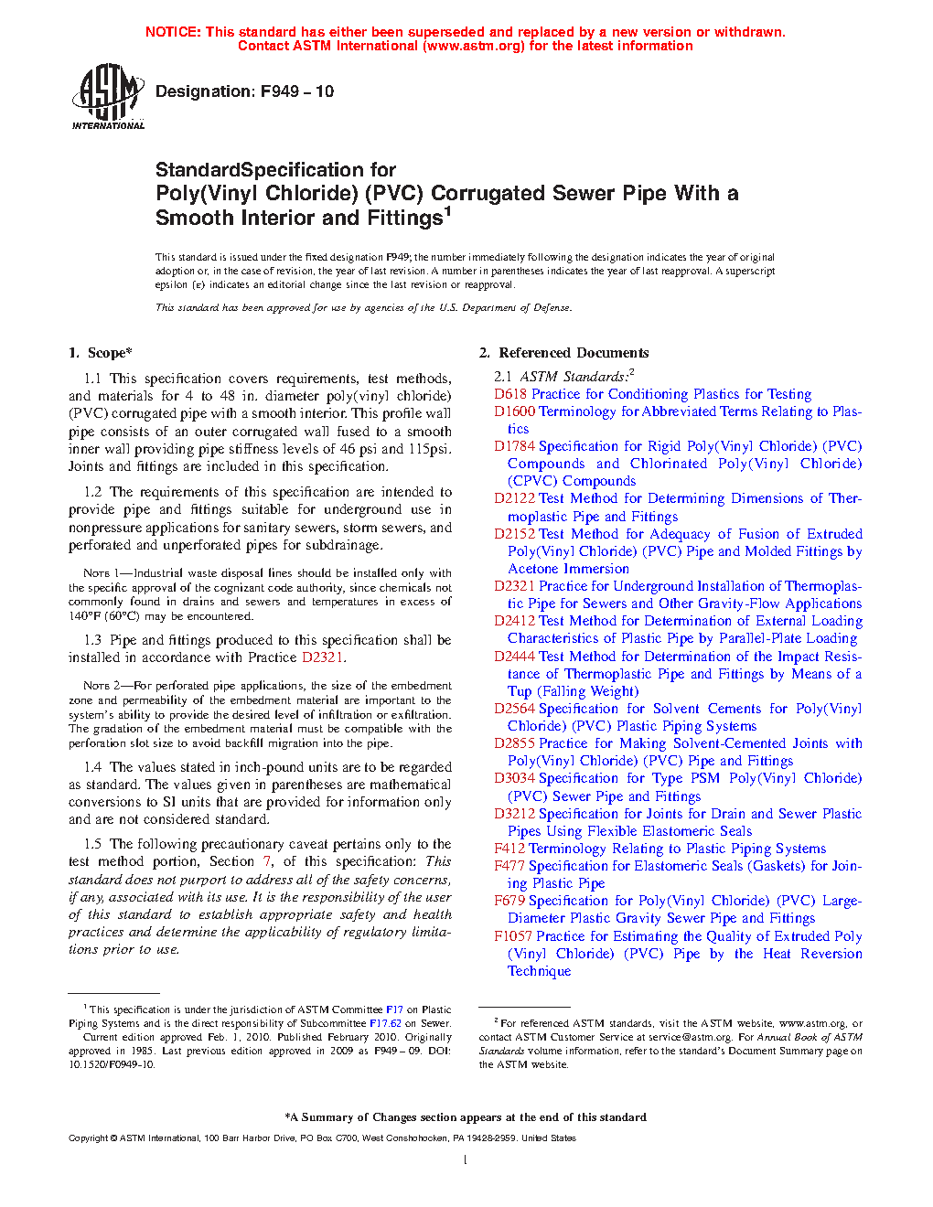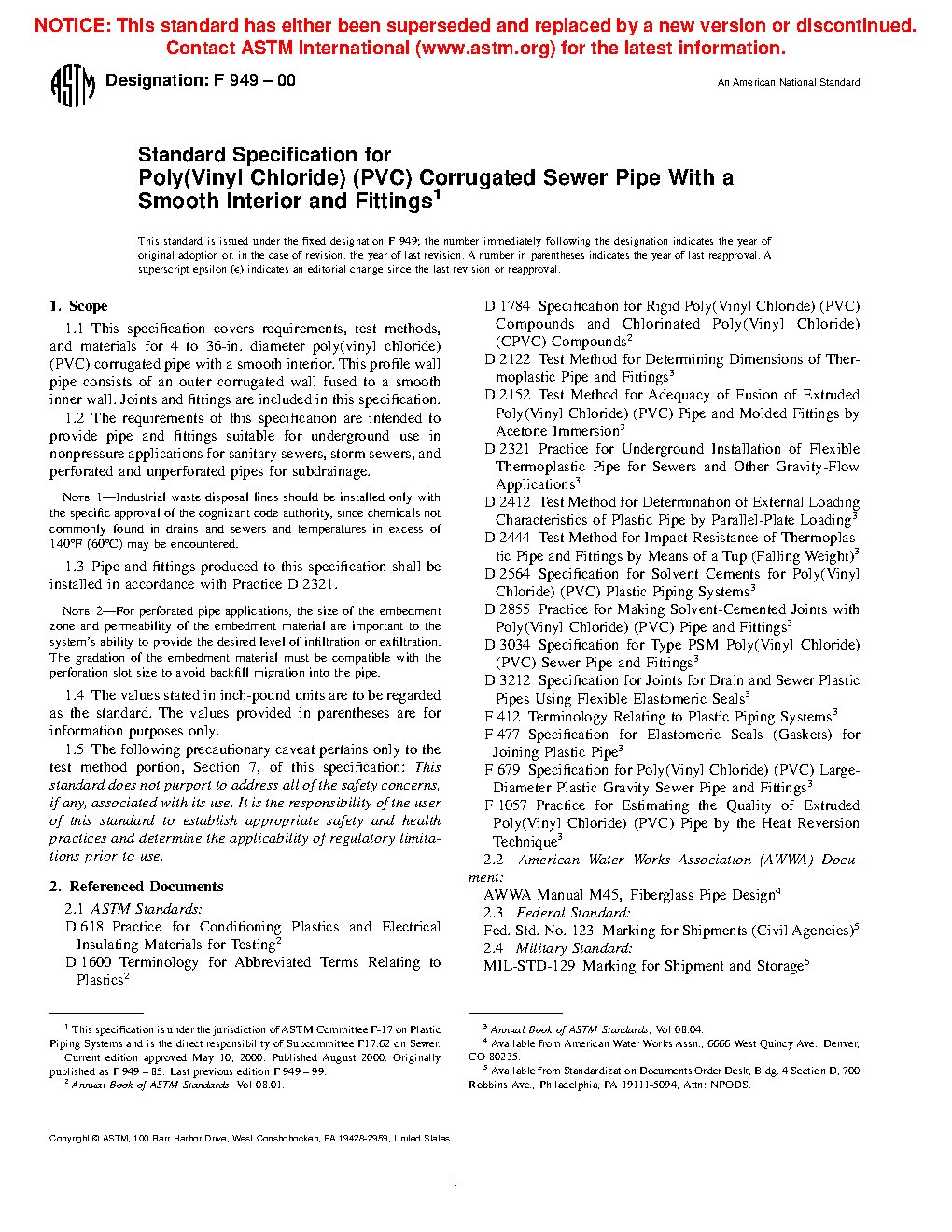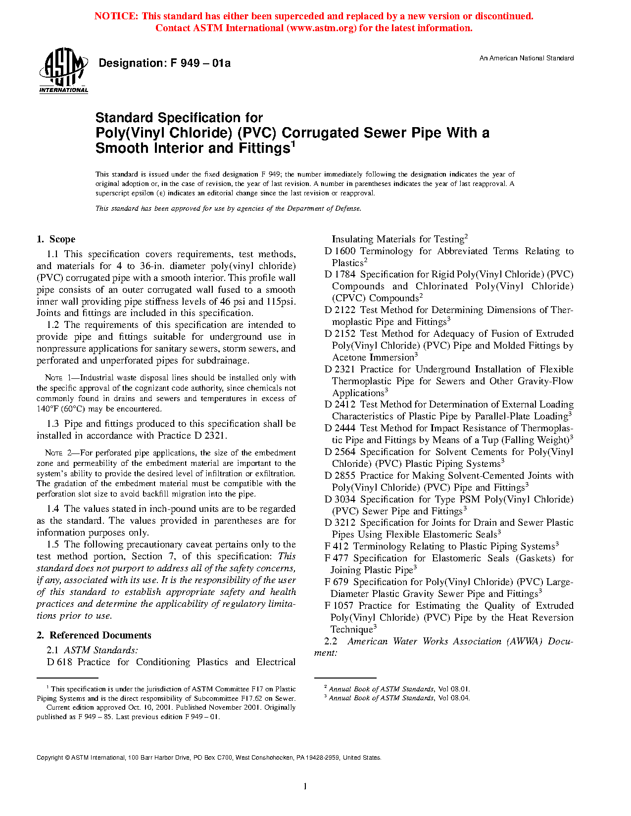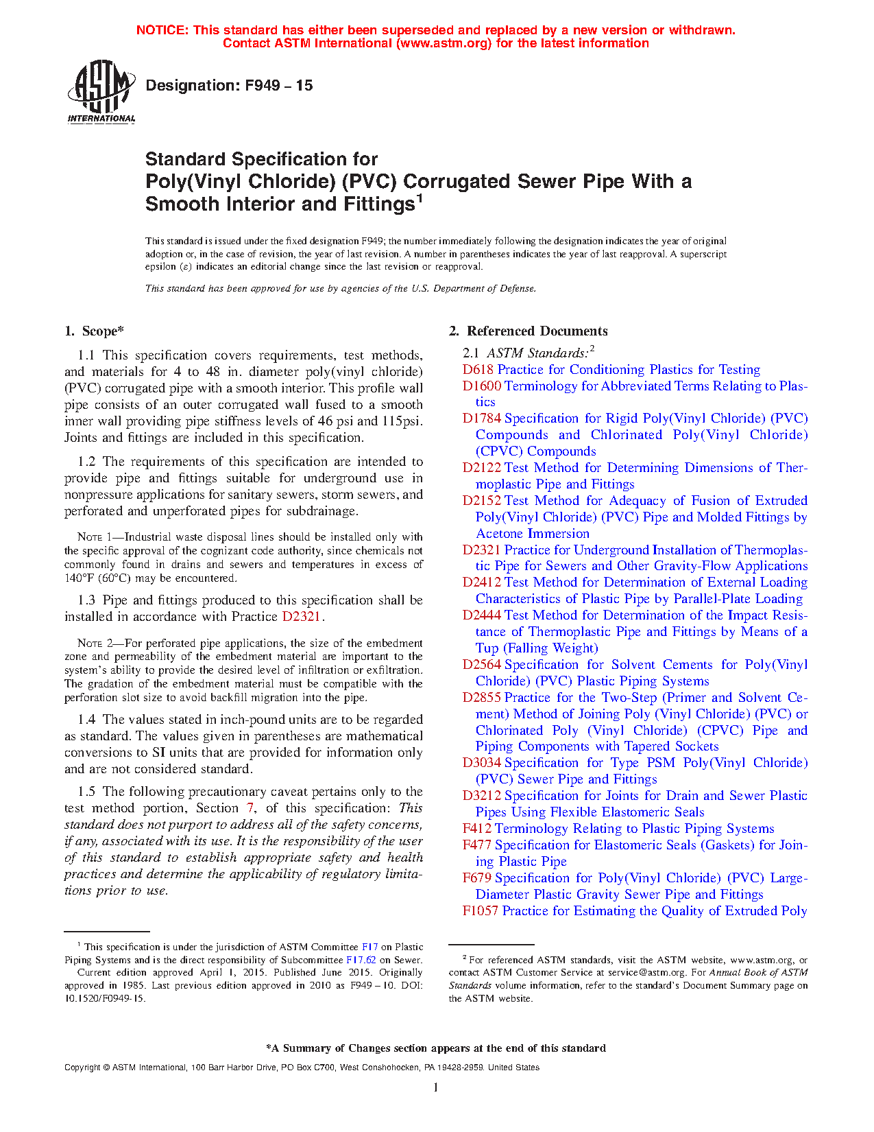 1.1 This specification covers requirements, test methods, and materials for 4 to 36-in. diameter poly(vinyl chloride) (PVC) corrugated pipe with a smooth interior. This profile wall pipe consists of an outer corrugated wall fused to a smooth inner wall providing pipe stiffness levels of 46 psi and 115psi. Joints and fittings are included in this specification.