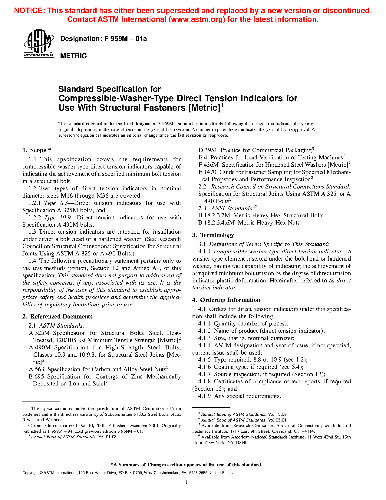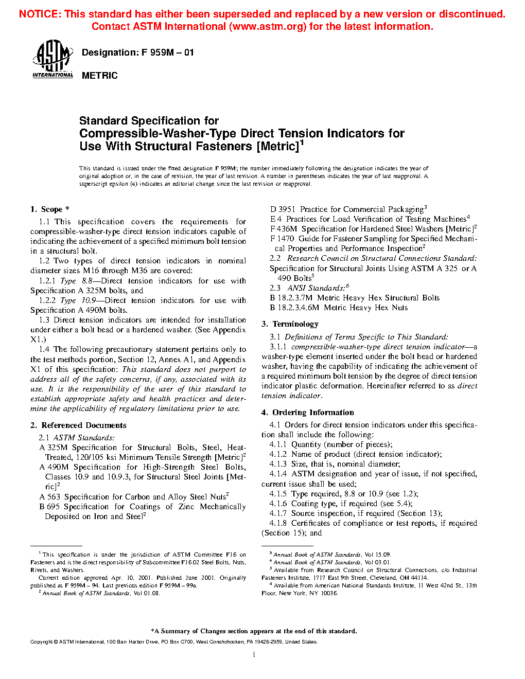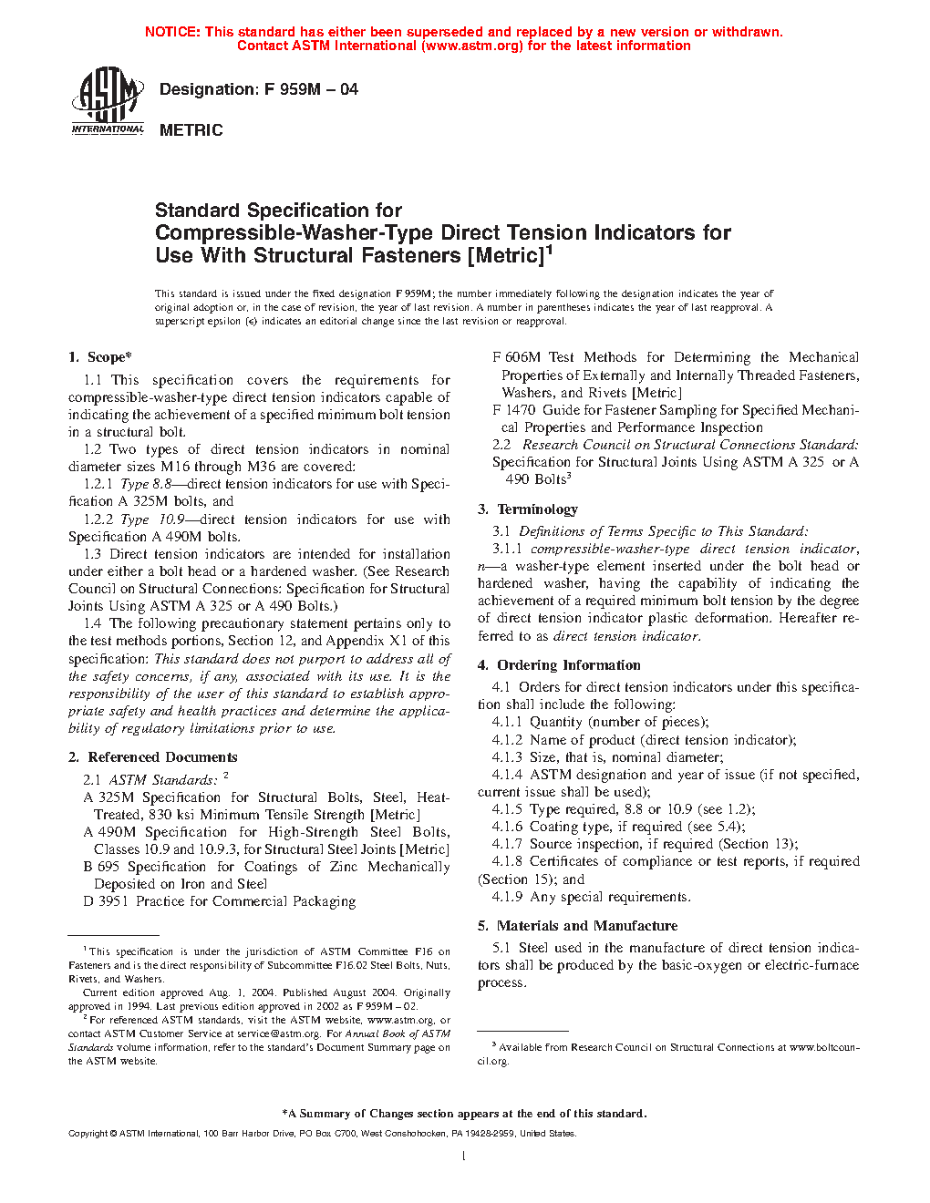 1.1 This specification covers the requirements for compressible-washer-type direct tension indicators capable of indicating the achievement of a specified minimum bolt tension in a structural bolt.