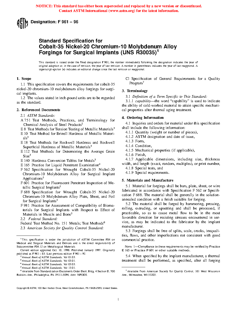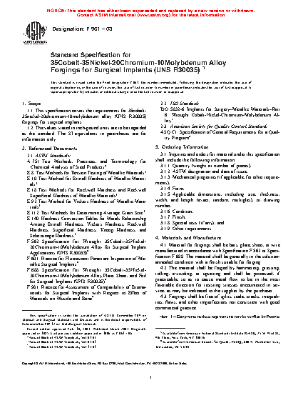 1.1 This specification covers the chemical, mechanical, and metallurgical requirements for 35cobalt-35nickel-20chromium-10molybdenum alloy (UNS R30035) in the form of forgings, used for the manufacture of surgical implants.