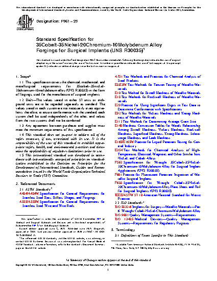 This specification covers the chemical composition and mechanical requirements for 35cobalt-35nickel-20chromium-10molybdenum alloy (UNS R30035) forgings for use in surgical implants. The material covered here shall be in the form of bars, plates, sheets, or wires manufactured in the solution-annealed condition with a finish suitable for forging by hammering, pressing, rolling, extruding, or upsetting.