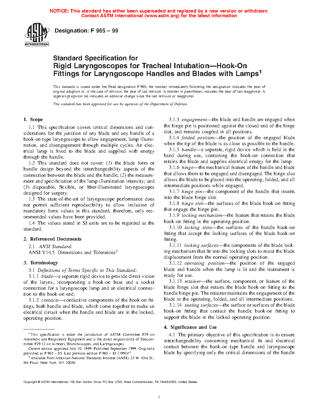 1.1 This specification covers critical dimensions and considerations for the junction of any blade and any handle of a hook-on type laryngoscope to allow engagement, lamp illumination, and disengagement through multiple cycles. An electrical lamp is fixed to the blade and supplied with energy through the handle.