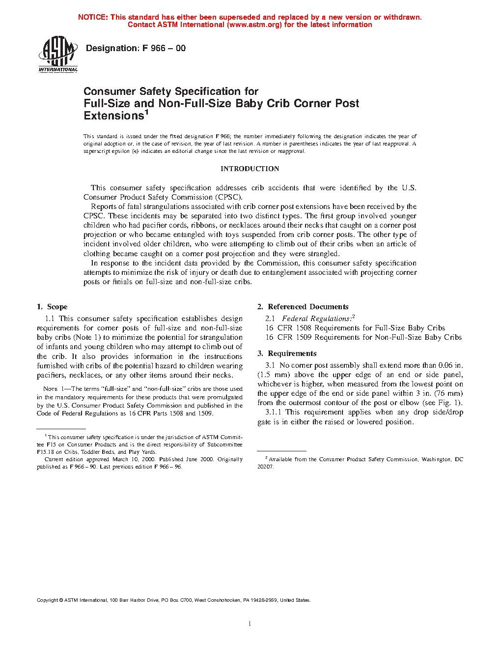 Note 1-The terms "full-size" and "non-full-size" cribs are those used in the mandatory requirements for these products that were promulgated by the U.S. Consumer Product Safety Commission and published in the Code of Federal Regulations as 16 CFR Parts 1508 and 1509.