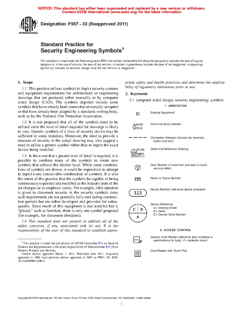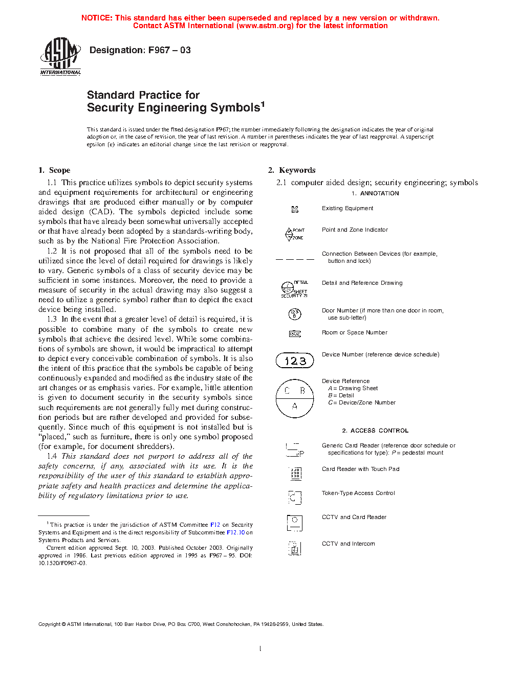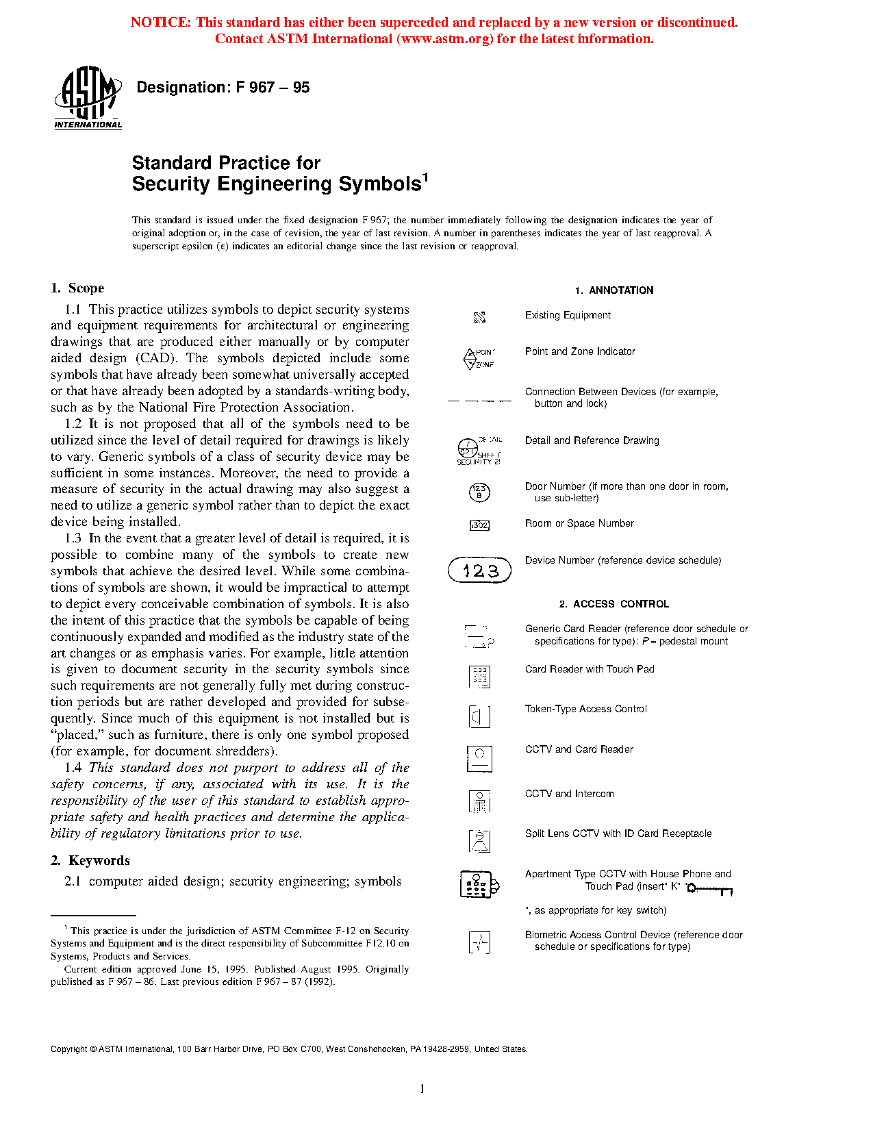1.2 It is not proposed that all of the symbols need to be utilized since the level of detail required for drawings is likely to vary. Generic symbols of a class of security device may be sufficient in some instances. Moreover, the need to provide a measure of security in the actual drawing may also suggest a need to utilize a generic symbol rather than to depict the exact device being installed.