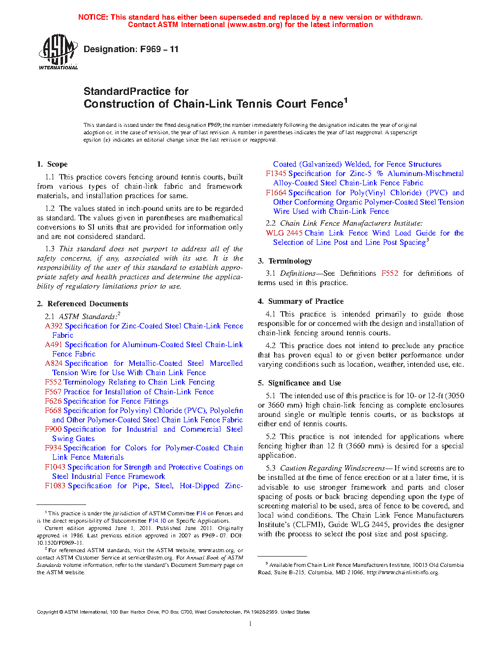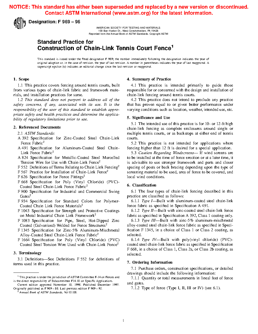 1.1 This practice covers fencing around tennis courts, built from various types of chain-link fabric and framework materials, and installation practices for same.