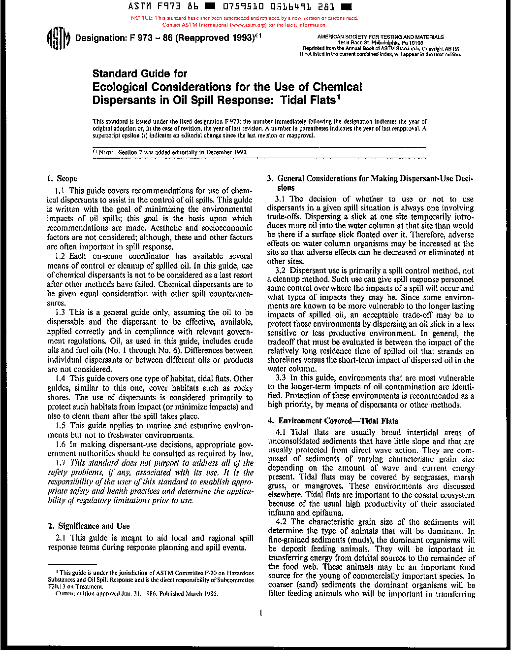 1.1 This guide covers recommendations for use of chemical dispersants to assist in the control of oil spills. This guide is written with the goal of minimizing the environmental impacts of oil spills; this goal is the basis upon which recommendations are made. Aesthetic and socioeconomic factors are not considered; although, these and other factors are often important in spill response.
