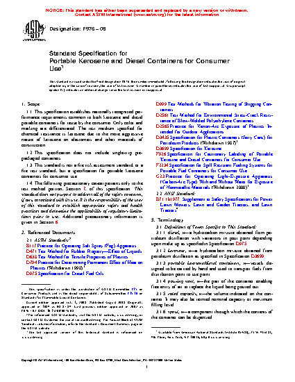 1.1 This specification establishes nationally recognized performance requirements common to both kerosene and diesel portable containers for reuse by the consumer. Only color and marking are differentiated. The test medium specified for chemical resistance is kerosene due to the more aggressive nature of kerosene on elastomers and other materials of construction.