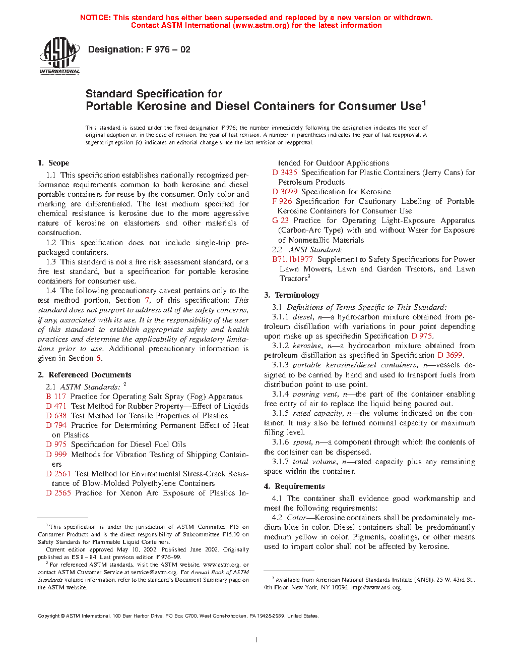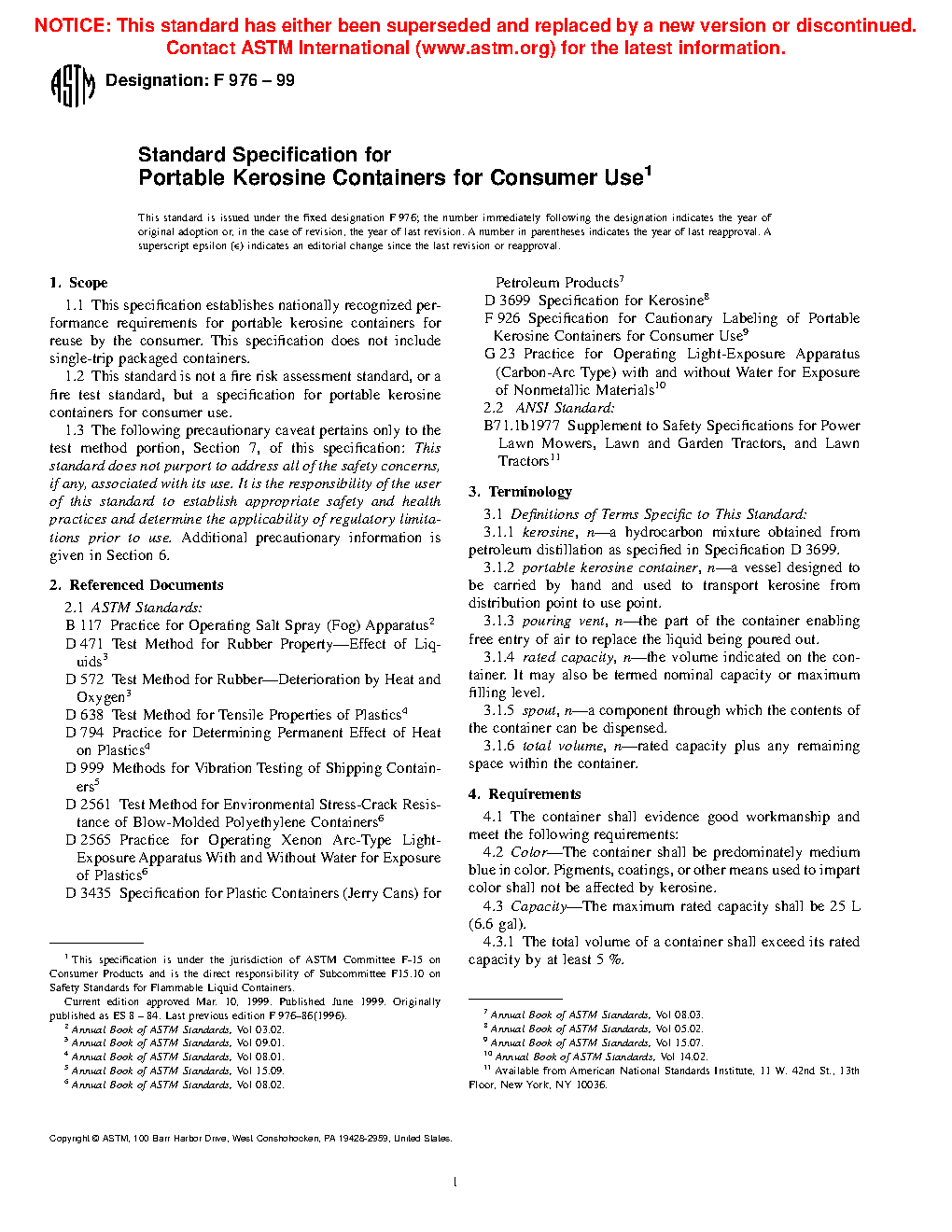 1.3 This standard is not a fire risk assessment standard, or a fire test standard, but a specification for portable kerosene containers for consumer use.