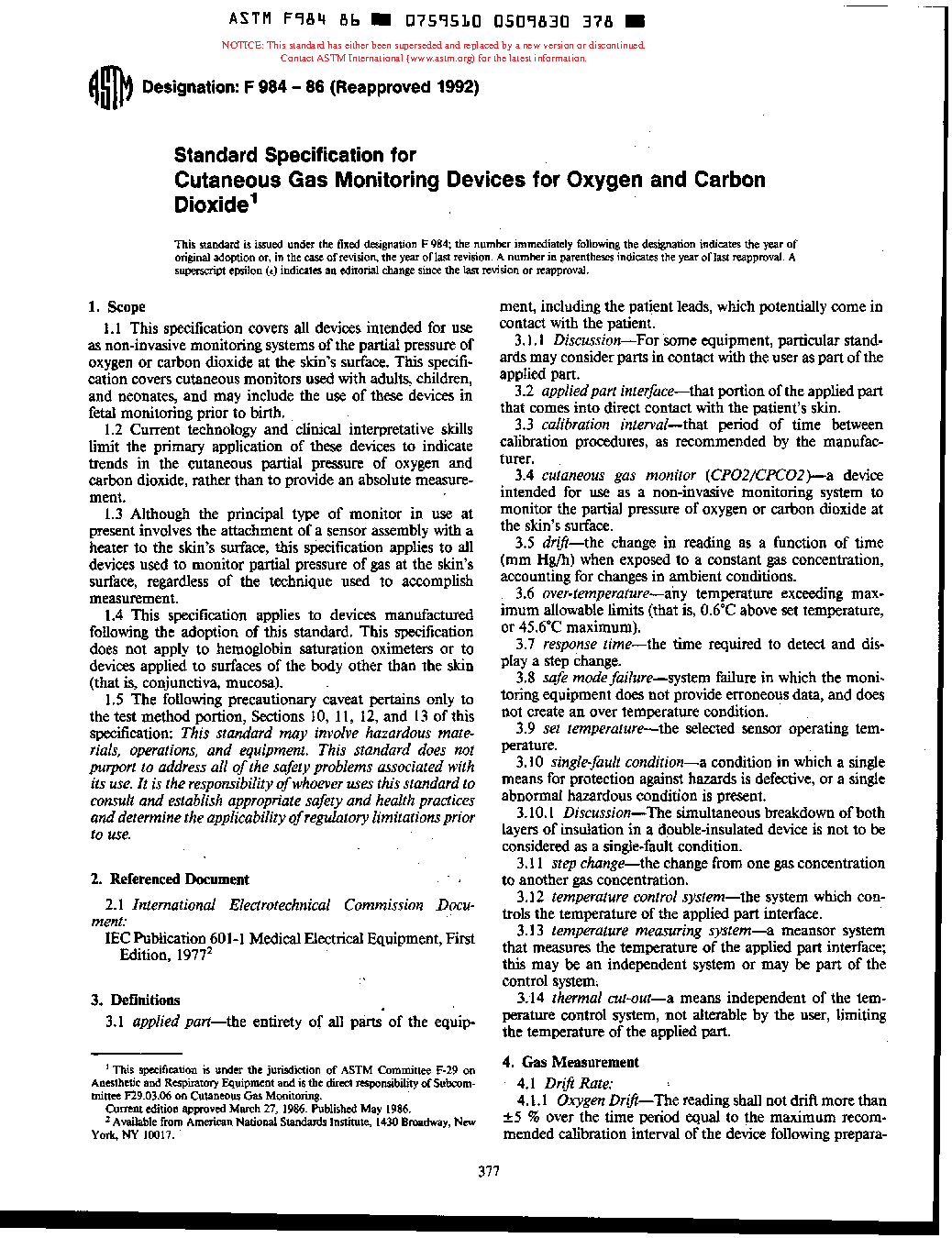 1.3 Although the principal type of monitor in use at present involves the attachment of a sensor assembly with a heater to the skin's surface, this specification applies to all devices used to monitor partial pressure of gas at the skin's surface, regardless of the technique used to accomplish measurement.