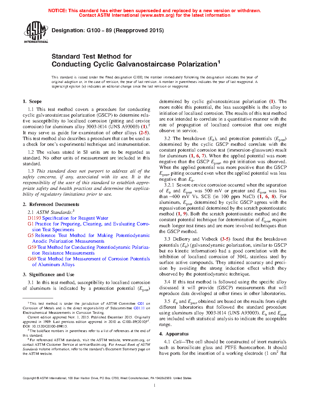 In this test method, susceptibility to localized corrosion of aluminum is indicated by a protection potential (Eprot) determined by cyclic galvanostaircase polarization (1). The more noble this potential, the less susceptible is the alloy to initiation of localized corrosion. The results of this test method are not intended to correlate in a quantitative manner with the rate of propagation of localized corrosion that one might observe in service.
